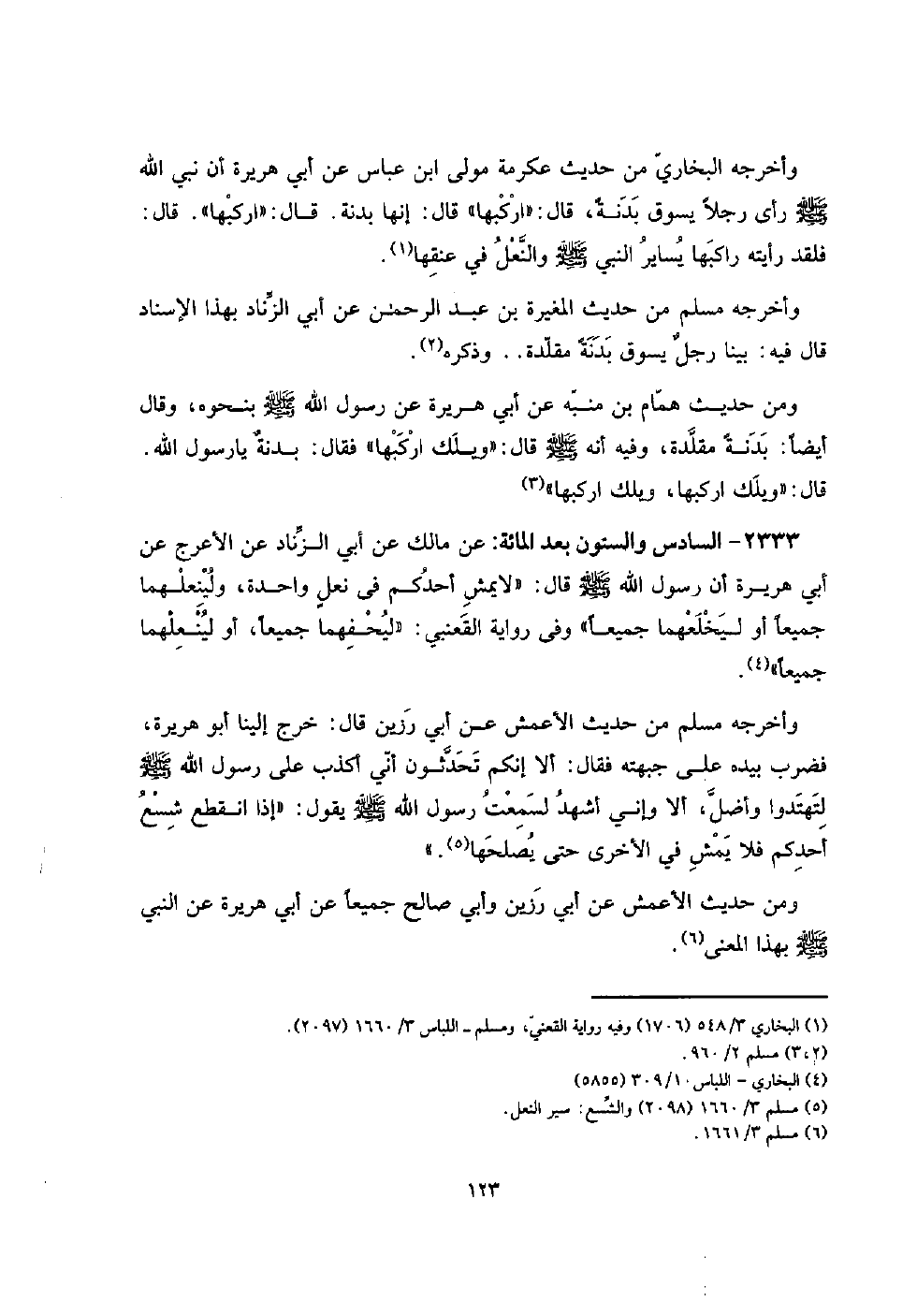 2333 - السَّادِس وَالسِّتُّونَ بعد الْمِائَة: عَن مَالك عَن أبي الزِّنَاد عَن الْأَعْرَج عَن أبي هُرَيْرَة أَن رَسُول الله صلى الله عَلَيْهِ وَسلم قَالَ: " لَا يمش أحدكُم فِي نعلٍ وَاحِدَة، ولينعلهما جَمِيعًا أَو ليخلعهما جَمِيعًا " وَفِي رِوَايَة القعْنبِي: " ليحفهما جَمِيعًا، أَو لينعلهما جَمِيعًا ".