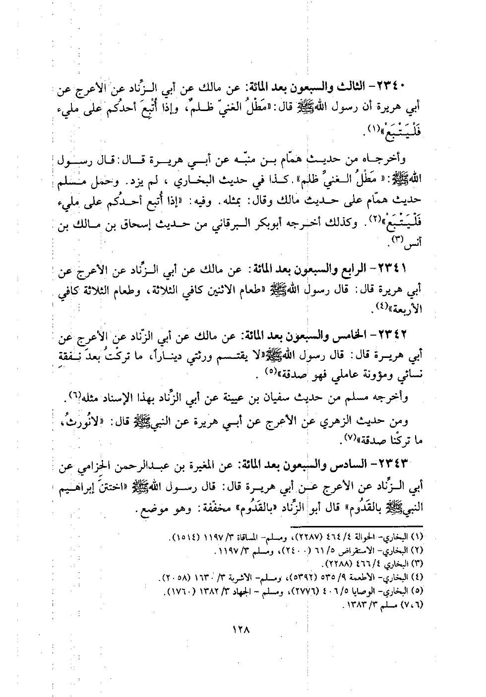 2340 - الثَّالِث وَالسَّبْعُونَ بعد الْمِائَة: عَن مَالك عَن أبي الزِّنَاد عَن الْأَعْرَج عَن أبي هُرَيْرَة أَن رَسُول الله صلى الله عَلَيْهِ وَسلم قَالَ: " مطل الْغَنِيّ ظلمٌ، وَإِذا أتبع أحدكُم على مَلِيء فَليتبعْ ".