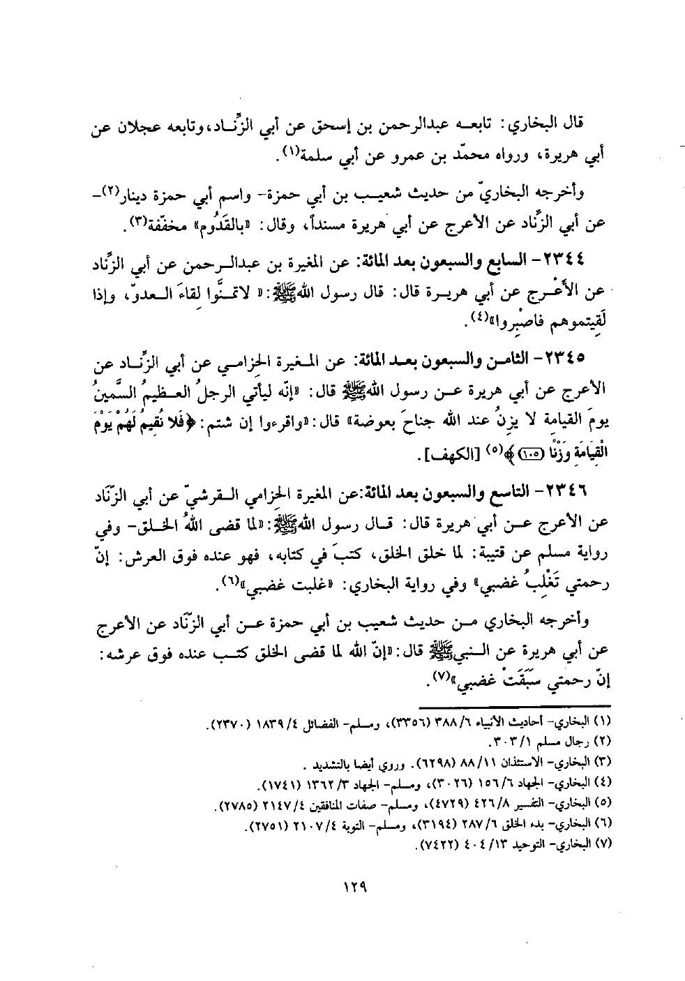 2346 - التَّاسِع وَالسَّبْعُونَ بعد الْمِائَة: عَن الْمُغيرَة الْحزَامِي الْقرشِي عَن أبي الزِّنَاد عَن الْأَعْرَج عَن أبي هُرَيْرَة قَالَ: قَالَ رَسُول الله صلى الله عَلَيْهِ وَسلم: " لما قضى الله الْخلق - وَفِي رِوَايَة مُسلم عَن قُتَيْبَة: لما خلق الْخلق، كتب فِي كِتَابه، فَهُوَ عِنْده فَوق الْعَرْش: إِن رَحْمَتي تغلب غَضَبي " وَفِي رِوَايَة البُخَارِيّ: " غلبت غَضَبي ".