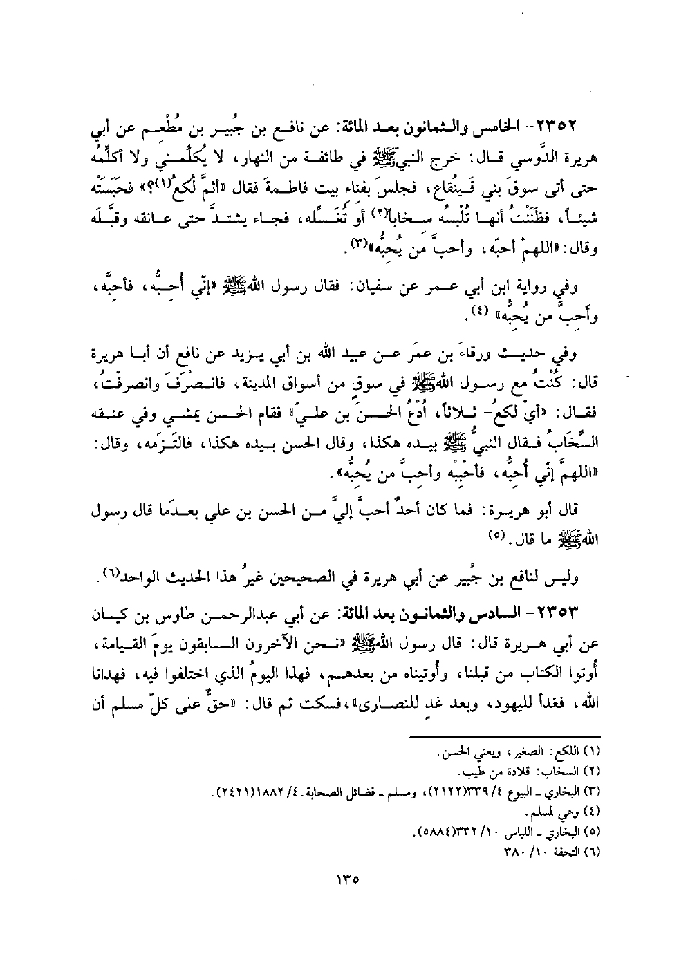 2352 - الْخَامِس وَالثَّمَانُونَ بعد الْمِائَة: عَن نَافِع بن جُبَير بن مطعم عَن أبي هُرَيْرَة الدوسي قَالَ: خرج النَّبِي صلى الله عَلَيْهِ وَسلم فِي طَائِفَة من النَّهَار، لَا يكلمني وَلَا ُأكَلِّمهُ حَتَّى أَتَى سوق بني قينقاع، فَجَلَسَ بِفنَاء بَيت فَاطِمَة فَقَالَ " أَثم لكع؟ " فحبسته شَيْئا، فَظَنَنْت أَنَّهَا تلبسه سخاباً أَو تغسله، فجَاء يشْتَد حَتَّى عانقه وَقَبله وَقَالَ: " اللَّهُمَّ أحبه، وَأحب من يُحِبهُ ".