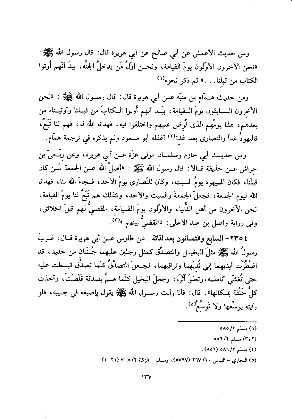 قَالَ رَسُول الله صلى الله عَلَيْهِ وَسلم، " نَحن الْآخرُونَ السَّابِقُونَ يَوْم الْقِيَامَة، بيد أَنهم أُوتُوا الْكتاب من قبلنَا وأوتيناه من بعدهمْ، هَذَا يومهم الَّذِي فرض عَلَيْهِم وَاخْتلفُوا فِيهِ، فهدانا الله لَهُ، فهم لنا تبعٌ، فاليهود غَدا وَالنَّصَارَى بعد غدٍ " أغفله أَبُو مَسْعُود وَلم يذكرهُ فِي تَرْجَمَة همام.