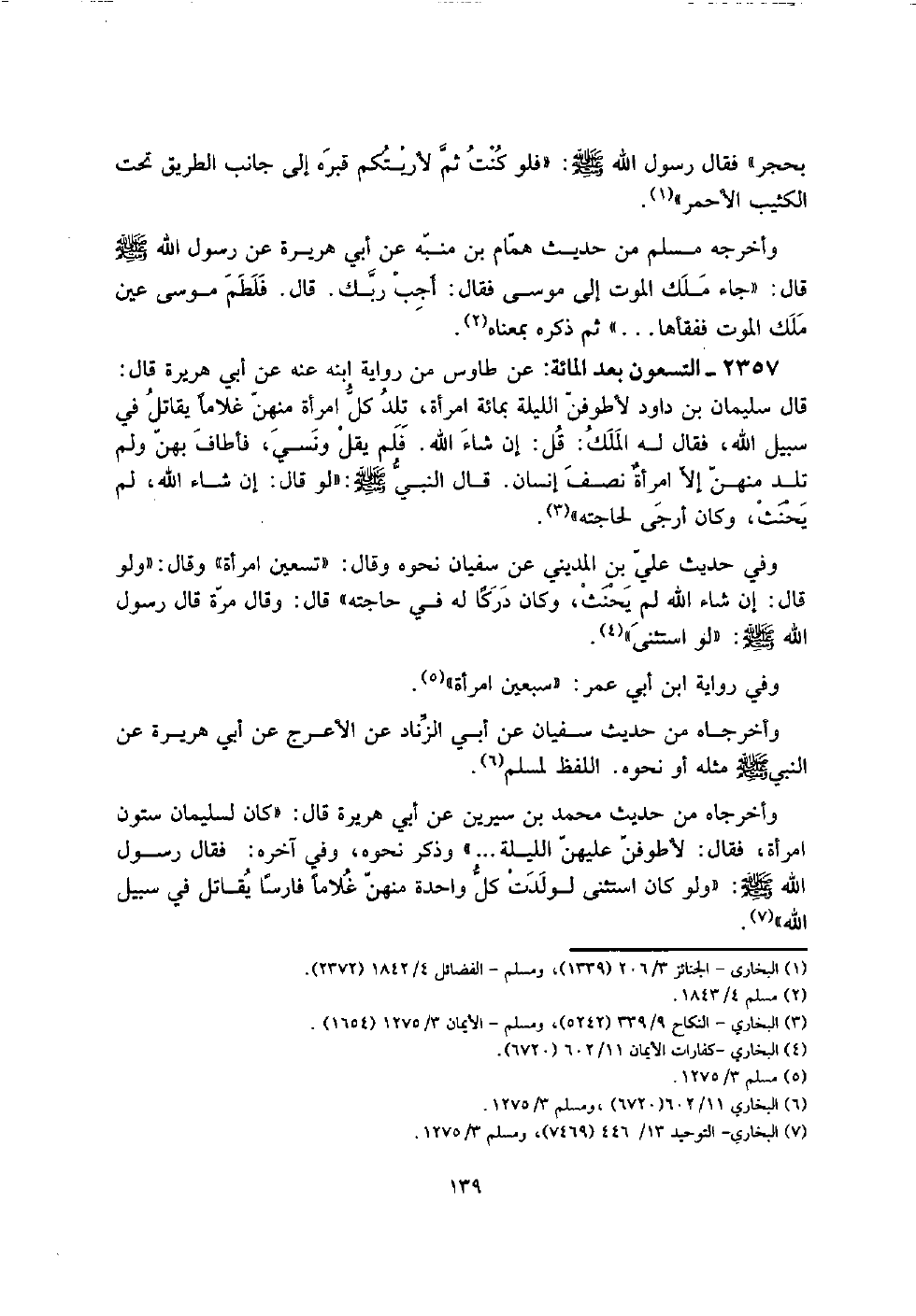 2357 - التِّسْعُونَ بعد الْمِائَة: عَن طَاوس من رِوَايَة ابْنه عَنهُ عَن أبي هُرَيْرَة قَالَ: قَالَ سُلَيْمَان بن دَاوُد لأطوفن اللَّيْلَة بِمِائَة امْرَأَة، تَلد كل امْرَأَة مِنْهُنَّ غُلَاما يُقَاتل فِي سَبِيل الله، فَقَالَ لَهُ الْملك: قل: إِن شَاءَ الله. فَلم يقل وَنسي، فأطاف بِهن وَلم تَلد مِنْهُنَّ إِلَّا امرأةٌ نصف إِنْسَان. قَالَ النَّبِي صلى الله عَلَيْهِ وَسلم: " لَو قَالَ: إِن شَاءَ الله، لم يَحْنَث، وَكَانَ أَرْجَى لِحَاجَتِهِ ".