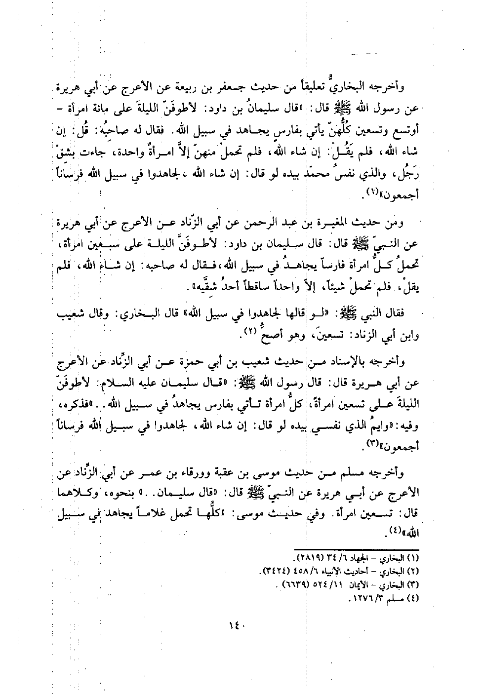 لأطوفن اللَّيْلَة على مائَة امْرَأَة - أَو تسع وَتِسْعين كُلهنَّ يَأْتِي بفارسٍ يُجَاهد فِي سَبِيل الله. فَقَالَ لَهُ صَاحبه: قل: إِن شَاءَ الله، فَلم يقل: إِن شَاءَ الله، فَلم تحمل مِنْهُنَّ إِلَّا امرأةٌ وَاحِدَة، جَاءَت بشق رجل، وَالَّذِي نفس مُحَمَّد بِيَدِهِ لَو قَالَ: إِن شَاءَ الله، لَجَاهَدُوا فِي سَبِيل الله فُرْسَانًا أَجْمَعُونَ ".