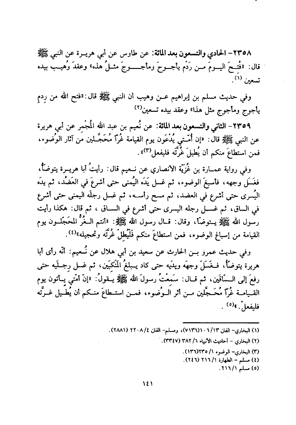2359 - الثَّانِي وَالتِّسْعُونَ بعد الْمِائَة: عَن نعيم بن عبد الله المجمر عَن أبي هُرَيْرَة عَن النَّبِي صلى الله عَلَيْهِ وَسلم قَالَ: " إِن أمتِي يدعونَ يَوْم الْقِيَامَة غراً محجلين من آثَار الْوضُوء، فَمن اسْتَطَاعَ مِنْكُم أَن يُطِيل غرته فَلْيفْعَل ".