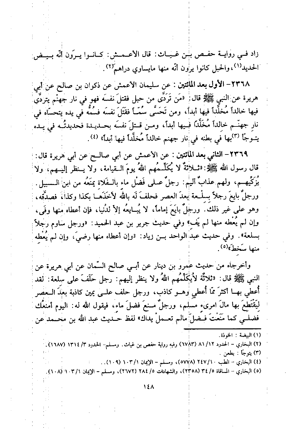 2369 - الثَّانِي بعد الْمِائَتَيْنِ: عَن الْأَعْمَش عَن أبي صَالح عَن أبي هُرَيْرَة قَالَ: قَالَ رَسُول الله صلى الله عَلَيْهِ وَسلم: " ثلاثةٌ لَا يكلمهم الله يَوْم الْقِيَامَة، وَلَا ينظر إِلَيْهِم، وَلَا يزكيهم، وَلَهُم عذابٌ أَلِيم: رجلٌ على فضل ماءٍ بالفلاة يمنعهُ من ابْن السَّبِيل.