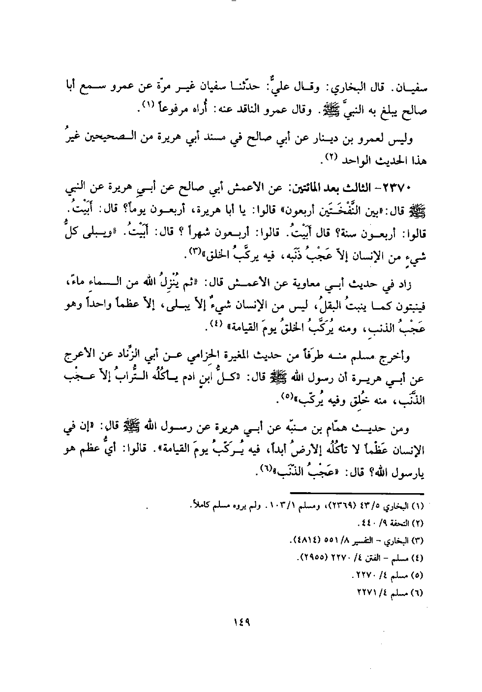 إِن فِي الْإِنْسَان عظما لَا تَأْكُله إلأرض أبدا، فِيهِ يركب يَوْم الْقِيَامَة ". قَالُوا: أَي عظم هُوَ يَا رَسُول الله؟ قَالَ: " عجب الذَّنب ".