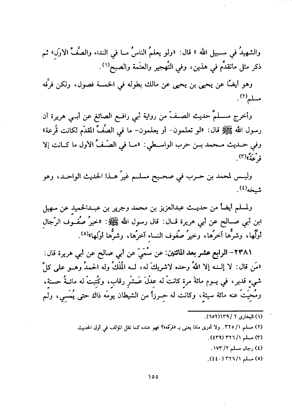 2381 - الرَّابِع عشر بعد الْمِائَتَيْنِ: عَن سمي عَن أبي صَالح عَن أبي هُرَيْرَة قَالَ: " من قَالَ: لَا إِلَه إِلَّا الله وَحده لَا شريك لَهُ، لَهُ الْملك وَله الْحَمد وَهُوَ على كل شيءٍ قدير، فِي يَوْم مائَة مرةٍ كَانَت لَهُ عدل عشر رقابٍ، وكتبت لَهُ مائَة حسنةٍ، ومحيت عَنهُ مائَة سيئةٍ، وَكَانَت لَهُ حرْزا من الشَّيْطَان يَوْمه ذَاك حَتَّى يُمْسِي، وَلم
