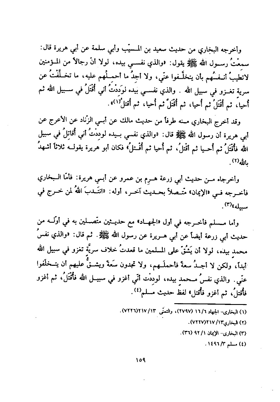 وَالَّذِي نفس محمدٍ بِيَدِهِ، لَوْلَا أَن يشق على الْمُسلمين مَا قعدت خلاف سريةٍ تغزو فِي سَبِيل الله أبدا، وَلَكِن لَا أجد سَعَة فأحملهم، وَلَا تَجِدُونَ سَعَة ويشق عَلَيْهِم أَن يتخلفوا عني. وَالَّذِي نفس محمدٍ بِيَدِهِ، لَوَدِدْت أَنِّي أغزو فِي سَبِيل الله فأقتل، ثمَّ أغزو فأقتل، ثمَّ أغزو فأقتل " لفظ حَدِيث مُسلم.