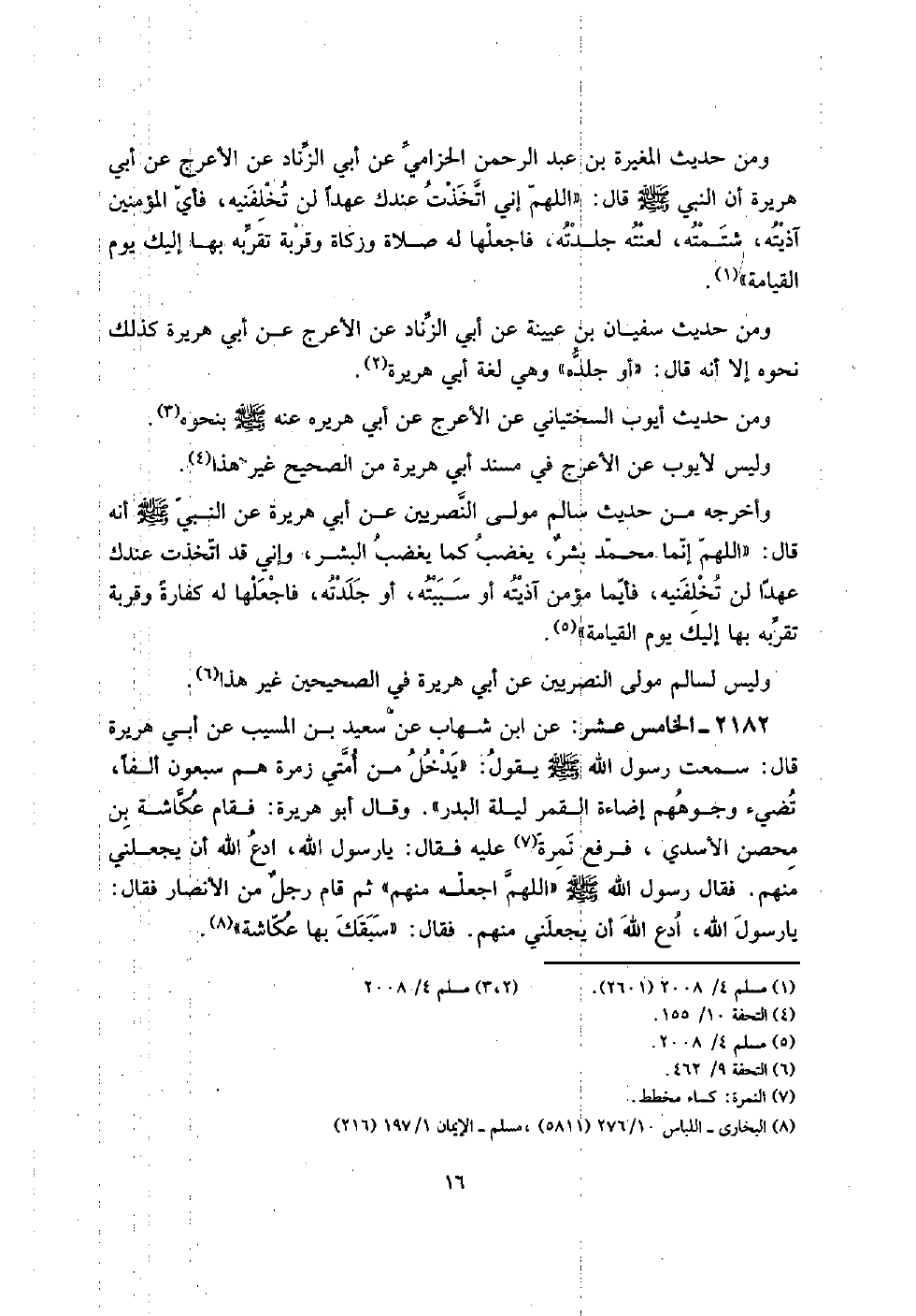 2182 - الْخَامِس عشر: عَن ابْن شهَاب عَن سعيد بن الْمسيب عَن أبي هُرَيْرَة قَالَ: سَمِعت رَسُول الله صلى الله عَلَيْهِ وَسلم يَقُول: " يدْخل من أمتِي زمرة هم سَبْعُونَ ألفا، تضيء وُجُوههم إضاءة الْقَمَر لَيْلَة الْبَدْر ". وَقَالَ أَبُو هُرَيْرَة: فَقَامَ عكاشة بن مُحصن الْأَسدي، فَرفع نمرة عَلَيْهِ فَقَالَ: يَا رَسُول الله، ادْع الله أَن يَجْعَلنِي مِنْهُم. فَقَالَ رَسُول الله صلى الله عَلَيْهِ وَسلم " اللَّهُمَّ اجْعَلْهُ مِنْهُم " ثمَّ قَامَ رجلٌ من الْأَنْصَار فَقَالَ: يَا رَسُول الله، ادْع الله أَن يَجْعَلنِي مِنْهُم. فَقَالَ: " سَبَقَك بهَا عكاشة ".
