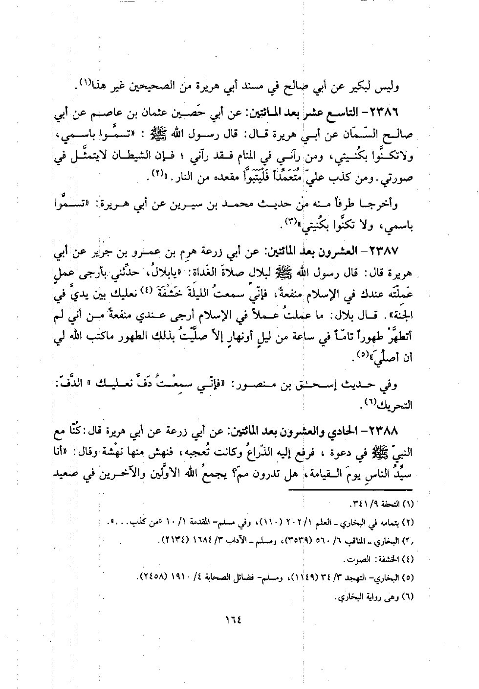 2386 - التَّاسِع عشر بعد الْمِائَتَيْنِ: عَن أبي حُصَيْن عُثْمَان بن عَاصِم عَن أبي صَالح السمان عَن أبي هُرَيْرَة قَالَ: قَالَ رَسُول الله صلى الله عَلَيْهِ وَسلم: " تسموا باسمي، وَلَا تكنوا بكنيتي، وَمن رَآنِي فِي الْمَنَام فقد رَآنِي؛ فَإِن الشَّيْطَان لَا يتَمَثَّل فِي صُورَتي. وَمن كذب عَليّ مُتَعَمدا فَليَتَبَوَّأ مَقْعَده من النَّار. "