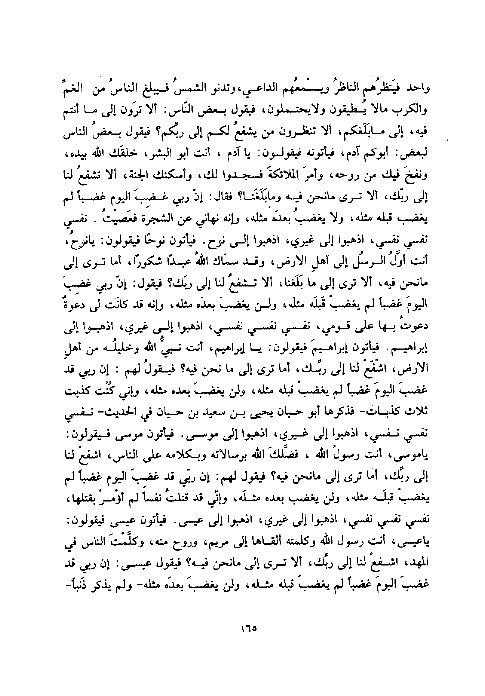 وَاحِد فينظرهم النَّاظر وَيسْمعهُمْ الدَّاعِي، وتدنو الشَّمْس فَيبلغ النَّاس من الْغم وَالْكرب مَالا يُطِيقُونَ وَلَا يحْتَملُونَ، فَيَقُول بعض النَّاس: أَلا ترَوْنَ إِلَى مَا أَنْتُم فِيهِ، إِلَى مَا بَلغَكُمْ، أَلا تنْظرُون من يشفع لكم إِلَى ربكُم؟ فَيَقُول بعض النَّاس لبَعض: أبوكم آدم، فيأتونه فَيَقُولُونَ: يَا آدم، أَنْت أَبُو الْبشر، خلقك الله بِيَدِهِ، وَنفخ فِيك من روحه، وَأمر الْمَلَائِكَة فسجدوا لَك، وأسكنك الْجنَّة، أَلا تشفع لنا إِلَى رَبك، أَلا ترى مَا نَحن فِيهِ وَمَا بلغنَا؟ فَقَالَ: إِن رَبِّي غضب الْيَوْم غَضبا لم يغْضب قبله مثله، وَلَا يغْضب بعده مثله، وَإنَّهُ نهاني عَن الشَّجَرَة فعصيت. نَفسِي نَفسِي نَفسِي، اذْهَبُوا إِلَى غَيْرِي، اذْهَبُوا إِلَى نوح. فَيَأْتُونَ نوحًا فَيَقُولُونَ: يَا نوح، أَنْت أول الرُّسُل إِلَى أهل الأَرْض، وَقد سماك الله عبدا شكُورًا، أما ترى إِلَى مَا نَحن فِيهِ، أَلا ترى إِلَى مَا بلغنَا، أَلا تشفع لنا إِلَى رَبك؟ فَيَقُول: إِن رَبِّي غضب الْيَوْم غَضبا لم يغْضب قبله مثله، وَلنْ يغْضب بعده مثله، وَإنَّهُ قد كَانَت لي دعوةٌ دَعَوْت بهَا على قومِي، نَفسِي نَفسِي نَفسِي، اذْهَبُوا إِلَى غَيْرِي، اذْهَبُوا إِلَى إِبْرَاهِيم. فَيَأْتُونَ إِبْرَاهِيم فَيَقُولُونَ: يَا إِبْرَاهِيم، أَنْت نَبِي الله وخليله من أهل الأَرْض، اشفع لنا إِلَى رَبك، أما ترى إِلَى مَا نَحن فِيهِ؟ فَيَقُول لَهُم: إِن رَبِّي قد غضب الْيَوْم غَضبا لم يغْضب قبله مثله، وَلنْ يغْضب بعده مثله، وَإِنِّي كنت كذبت ثَلَاث كذبات - فَذكرهَا أَبُو حَيَّان يحيى بن سعيد بن حَيَّان فِي الحَدِيث - نَفسِي نَفسِي نَفسِي، اذْهَبُوا إِلَى غَيْرِي، اذْهَبُوا إِلَى مُوسَى. فَيَأْتُونَ مُوسَى فَيَقُولُونَ: يَا مُوسَى، أَنْت رَسُول الله، فضلك الله بِرِسَالَاتِهِ وبكلامه على النَّاس، اشفع لنا إِلَى رَبك، أما ترى إِلَى مَا نَحن فِيهِ؟ فَيَقُول لَهُم: إِن رَبِّي قد غضب الْيَوْم غَضبا لم يغْضب قبله مثله، وَلنْ يغْضب بعده مثله، وَإِنِّي قد قتلت نفسا لم أُؤمر بقتلها، نَفسِي نَفسِي نَفسِي، اذْهَبُوا إِلَى غَيْرِي، اذْهَبُوا إِلَى عِيسَى. فَيَأْتُونَ عِيسَى فَيَقُولُونَ: يَا عِيسَى، أَنْت رَسُول الله وكلمته أَلْقَاهَا إِلَى مَرْيَم، وروح مِنْهُ، وَكلمت النَّاس فِي المهد، اشفع لنا إِلَى رَبك، أَلا ترى إِلَى مَا نَحن فِيهِ؟ فَيَقُول عِيسَى: إِن رَبِّي قد غضب الْيَوْم غَضبا لم يغْضب قبله مثله، وَلنْ يغْضب بعده مثله - وَلم يذكر ذَنبا -
