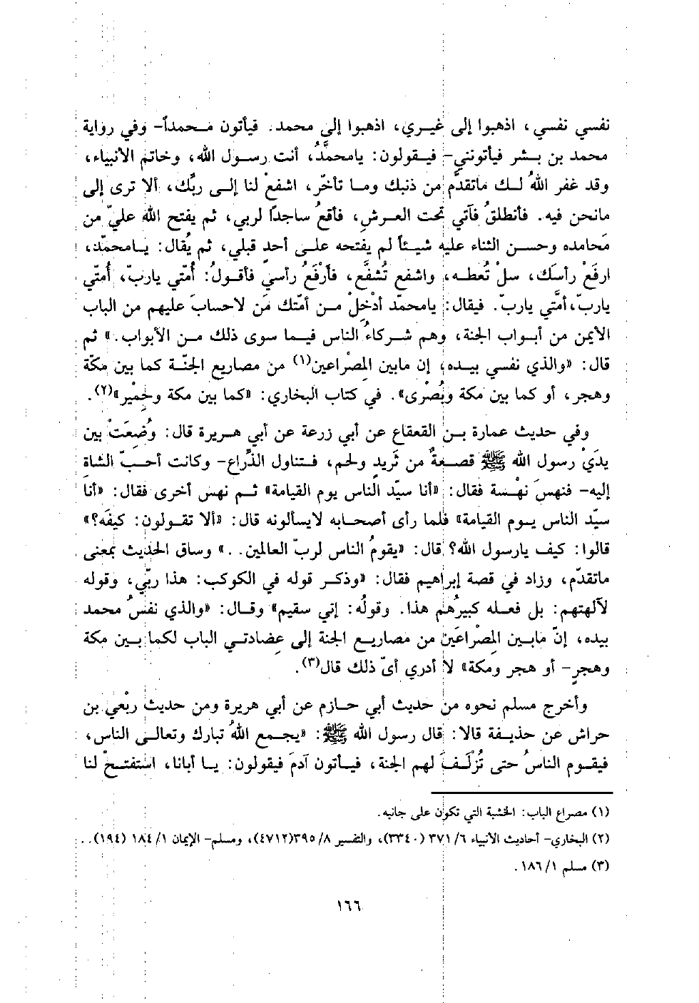 نَفسِي نَفسِي، اذْهَبُوا إِلَى غَيْرِي، اذْهَبُوا إِلَى مُحَمَّد. فَيَأْتُونَ مُحَمَّدًا - وَفِي رِوَايَة مُحَمَّد بن بشر فيأتونني - فَيَقُولُونَ: يَا مُحَمَّد، أَنْت رَسُول الله، وَخَاتم الْأَنْبِيَاء، وَقد غفر الله لَك مَا تقدم من ذَنْبك وَمَا تَأَخّر، اشفع لنا إِلَى رَبك، أَلا ترى إِلَى مَا نَحن فِيهِ. فأنطلق فَآتي تَحت الْعَرْش، فأقع سَاجِدا لرَبي، ثمَّ يفتح الله عَليّ من محامده وَحسن الثَّنَاء عَلَيْهِ شَيْئا لم يَفْتَحهُ على أحدٍ قبلي، ثمَّ يُقَال: يَا مُحَمَّد، ارْفَعْ رَأسك، سل تعطه، وَاشْفَعْ تشفع، فأرفع رَأْسِي فَأَقُول: أمتِي يَا رب، أمتِي يَا رب، أمتِي يَا رب. فَيُقَال: يَا مُحَمَّد أَدخل من أمتك من لَا حِسَاب عَلَيْهِم من الْبَاب الْأَيْمن من أَبْوَاب الْجنَّة، وهم شُرَكَاء النَّاس فِيمَا سوى ذَلِك من الْأَبْوَاب. " ثمَّ قَالَ: " وَالَّذِي نَفسِي بِيَدِهِ، إِن مَا بَين المصراعين من مصاريع الْجنَّة كَمَا بَين مَكَّة وهجر، أَو كَمَا بَين مَكَّة وَبصرى ". فِي كتاب البُخَارِيّ: " كَمَا بَين مَكَّة وحمير ".