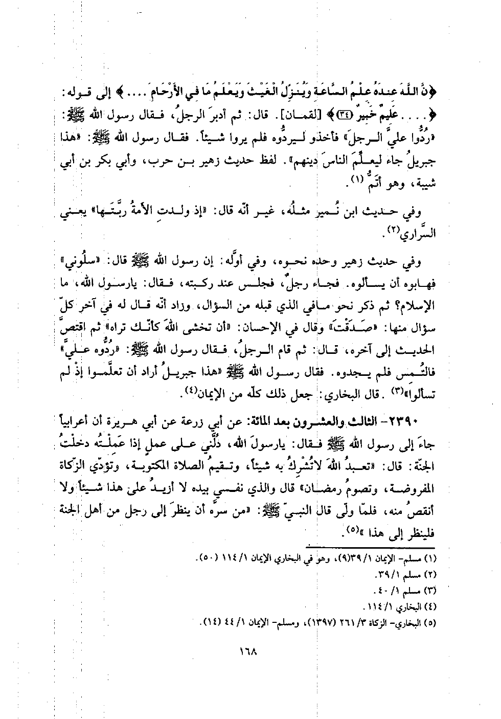 {ن الله عِنْده علم السَّاعَة وَينزل الْغَيْث وَيعلم مَا فِي الْأَرْحَام} إِلَى قَوْله: {عليم خَبِير} [لُقْمَان] . قَالَ: ثمَّ أدبر، الرجل، فَقَالَ رَسُول الله صلى الله عَلَيْهِ وَسلم: " ردوا عَليّ الرجل " فَأخذُوا ليردوه فَلم يرَوا شَيْئا. فَقَالَ رَسُول الله صلى الله عَلَيْهِ وَسلم: " هَذَا جِبْرِيل جَاءَ ليعلم النَّاس دينهم ". لفظ حَدِيث زُهَيْر بن حَرْب، وَأبي بكر بن أبي شيبَة، وَهُوَ أتم.