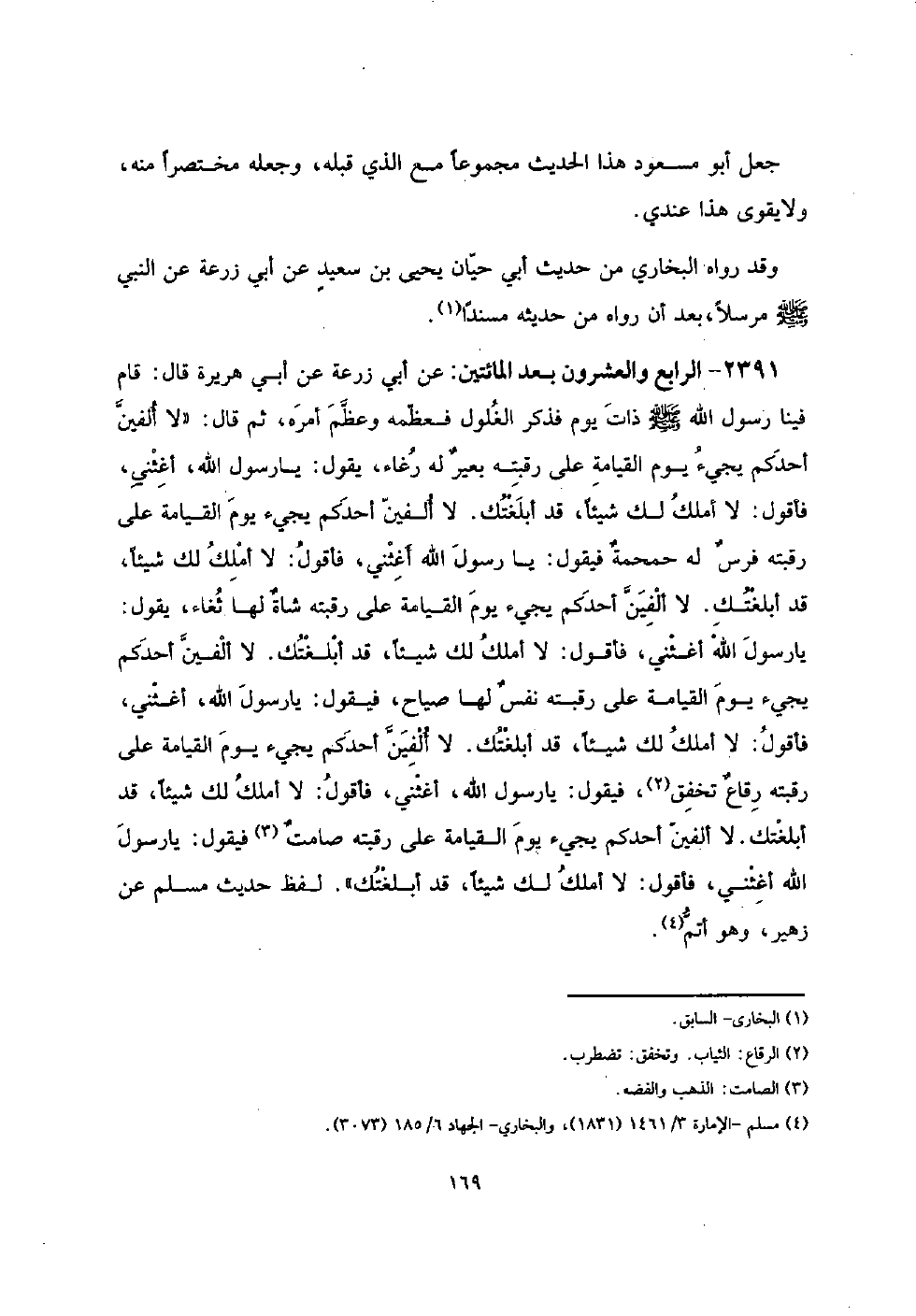 2391 - الرَّابِع وَالْعشْرُونَ بعد الْمِائَتَيْنِ: عَن أبي زرْعَة عَن أبي هُرَيْرَة قَالَ: قَامَ فِينَا رَسُول الله صلى الله عَلَيْهِ وَسلم ذَات يَوْم فَذكر الْغلُول فَعَظمهُ وَعظم أمره، ثمَّ قَالَ: " لَا أَلفَيْنِ أحدكُم يَجِيء يَوْم الْقِيَامَة على رقبته بعيرٌ لَهُ رُغَاء، يَقُول: يَا رَسُول الله، أَغِثْنِي، فَأَقُول: لَا أملك لَك شَيْئا، قد أبلغتك. لَا أَلفَيْنِ أحدكُم يَجِيء يَوْم الْقِيَامَة على رقبته فرسٌ لَهُ حمحمةٌ فَيَقُول: يَا رَسُول الله أَغِثْنِي، فَأَقُول: لَا أملك لَك شَيْئا، قد أبلغتك. لَا أَلفَيْنِ أحدكُم يَجِيء يَوْم الْقِيَامَة على رقبته شاةٌ لَهَا ثُغَاء، يَقُول: يَا رَسُول الله أَغِثْنِي، فَأَقُول: لَا أملك لَك شَيْئا، قد أبلغتك. لَا أَلفَيْنِ أحدكُم يَجِيء يَوْم الْقِيَامَة على رقبته نفسٌ لَهَا صياح، فَيَقُول: يَا رَسُول الله، أَغِثْنِي، فَأَقُول: لَا أملك لَك شَيْئا، قد أبلغتك. لَا أَلفَيْنِ أحدكُم يَجِيء يَوْم الْقِيَامَة على رقبته رقاعٌ تخفق، فَيَقُول: يَا رَسُول الله، أَغِثْنِي، فَأَقُول: لَا أملك لَك شَيْئا، قد أبلغتك. لَا أَلفَيْنِ أحدكُم يَجِيء يَوْم الْقِيَامَة على رقبته صامتٌ فَيَقُول: يَا رَسُول الله أَغِثْنِي، فَأَقُول: لَا أملك لَك شَيْئا، قد أبلغتك ". لفظ حَدِيث مُسلم عَن زُهَيْر، وَهُوَ أتم.