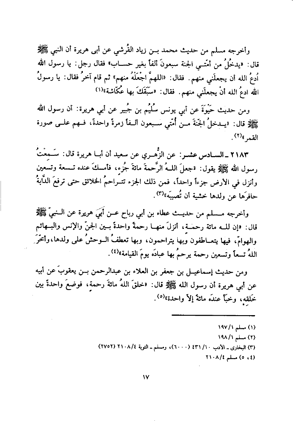 2183 - السَّادِس عشر: عَن الزُّهْرِيّ عَن سعيد أَن أَبَا هُرَيْرَة قَالَ: سَمِعت رَسُول الله صلى الله عَلَيْهِ وَسلم يَقُول: " جعل الله الرَّحْمَة مائَة جزءٍ، فَأمْسك عِنْده تِسْعَة وَتِسْعين وَأنزل فِي الأَرْض جُزْءا وَاحِدًا، فَمن ذَلِك الْجُزْء تتراحم الْخَلَائق حَتَّى ترفع الدَّابَّة حافرها عَن وَلَدهَا خشيَة أَن تصيبه ".