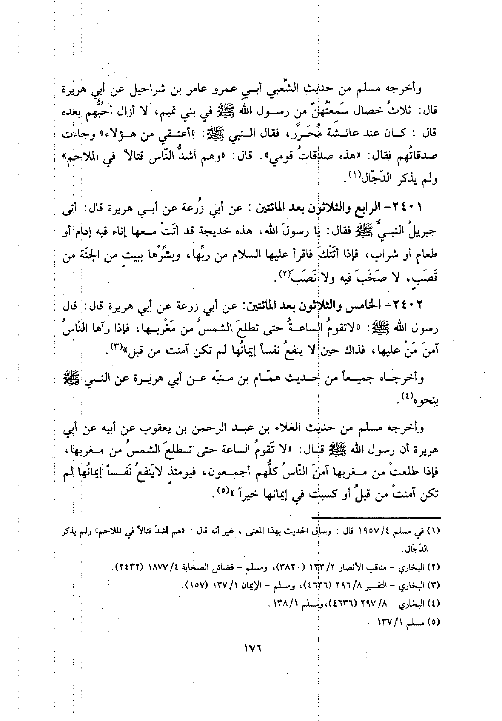 2402 - الْخَامِس وَالثَّلَاثُونَ بعد الْمِائَتَيْنِ: عَن أبي زرْعَة عَن أبي هُرَيْرَة قَالَ: قَالَ رَسُول الله صلى الله عَلَيْهِ وَسلم: " لَا تقوم السَّاعَة حَتَّى تطلع الشَّمْس من مغْرِبهَا، فَإِذا رَآهَا النَّاس آمن من عَلَيْهَا، فَذَاك حِين لَا ينفع نفسا إيمَانهَا لم تكن آمَنت من قبل ".