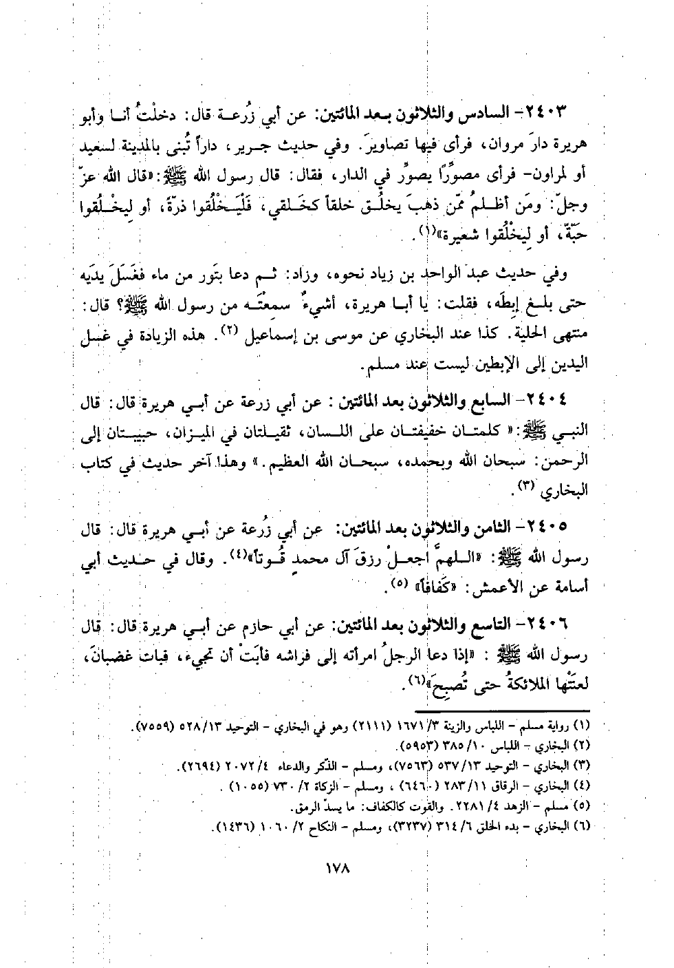 2403 - السَّادِس وَالثَّلَاثُونَ بعد الْمِائَتَيْنِ: عَن أبي زرْعَة قَالَ: دخلت أَنا وَأَبُو هُرَيْرَة دَار مَرْوَان، فَرَأى فِيهَا تصاوير. وَفِي حَدِيث جرير، دَارا تبنى بِالْمَدِينَةِ لسَعِيد أَو لمروان - فَرَأى مصوراً يصور فِي الدَّار، فَقَالَ: قَالَ رَسُول الله صلى الله عَلَيْهِ وَسلم: " قَالَ الله عز وَجل: وَمن أظلم مِمَّن ذهب يخلق خلقا كخلقي، فليخلقوا ذرة، أَو ليخلقوا حَبَّة، أَو ليخلقوا شعيرَة ".