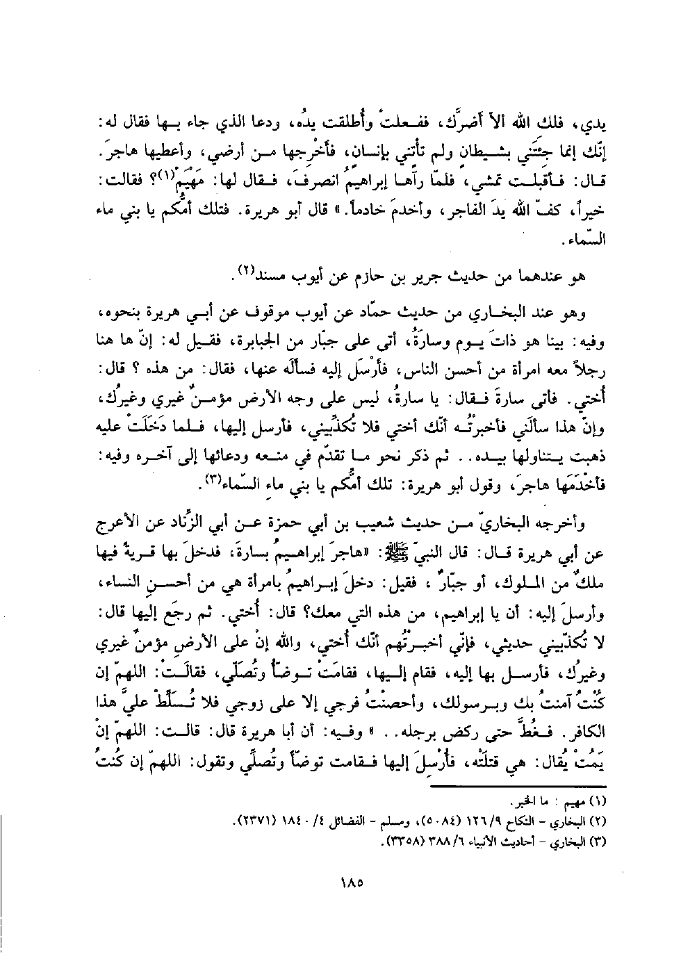 قَالَ: فَأَقْبَلت تمشي، فَلَمَّا رَآهَا إِبْرَاهِيم انْصَرف، فَقَالَ لَهَا: مَهيم؟ فَقَالَت: خيرا، كف الله يَد الْفَاجِر، وَأَخْدَم خَادِمًا. " قَالَ أَبُو هُرَيْرَة. فَتلك أمكُم يَا بني مَاء السَّمَاء.