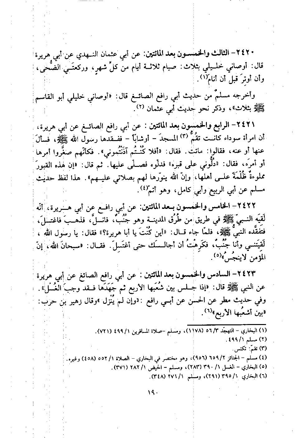2420 - الثَّالِث وَالْخَمْسُونَ بعد الْمِائَتَيْنِ: عَن أبي عُثْمَان النَّهْدِيّ عَن أبي هُرَيْرَة قَالَ: أَوْصَانِي خليلي بِثَلَاث: صِيَام ثَلَاثَة أَيَّام من كل شهرٍ، وركعتي الضُّحَى، وَأَن أوتر قبل أَن أَنَام.