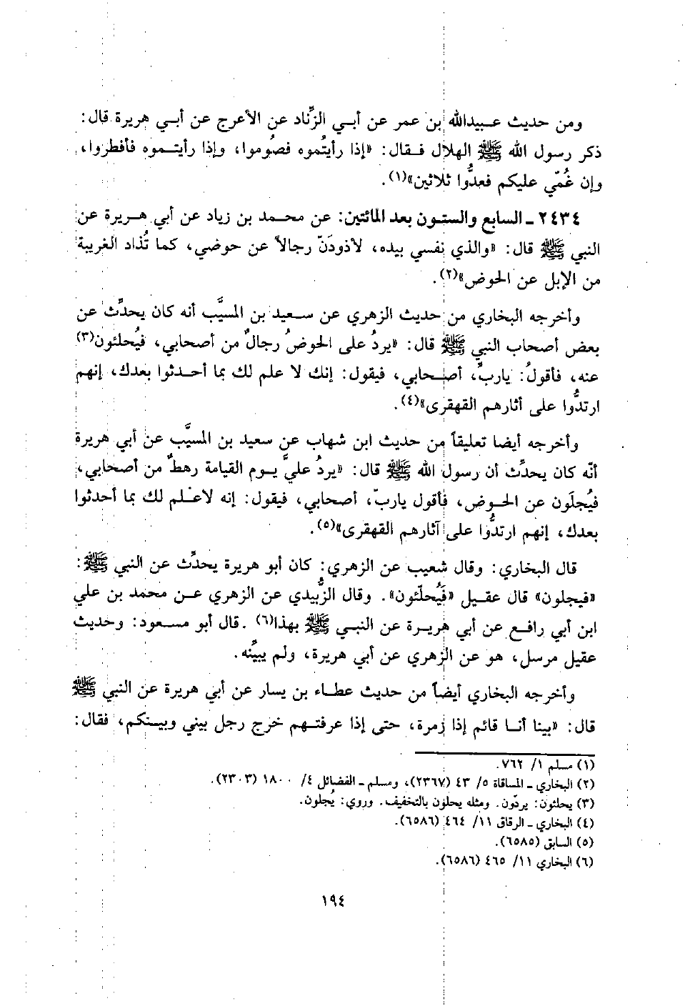 2434 - السَّابِع وَالسِّتُّونَ بعد الْمِائَتَيْنِ: عَن مُحَمَّد بن زِيَاد عَن أبي هُرَيْرَة عَن النَّبِي صلى الله عَلَيْهِ وَسلم قَالَ: " وَالَّذِي نَفسِي بِيَدِهِ، لأذودن رجَالًا عَن حَوْضِي، كَمَا تذاد الغريبة من الْإِبِل عَن الْحَوْض ".