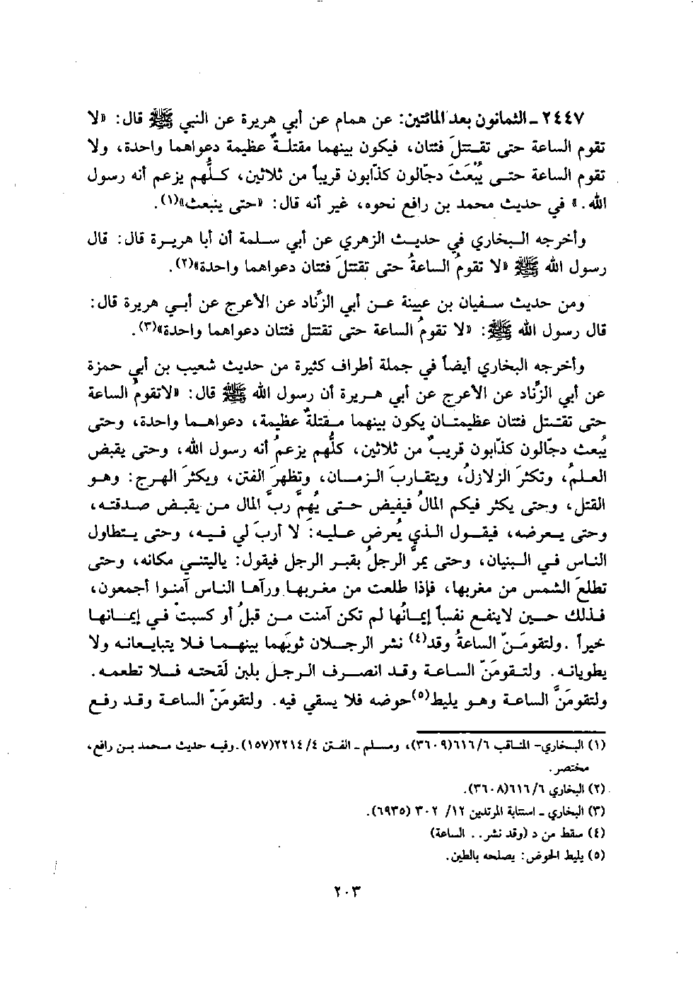 2447 - الثَّمَانُونَ بعد الْمِائَتَيْنِ: عَن همام عَن أبي هُرَيْرَة عَن النَّبِي صلى الله عَلَيْهِ وَسلم قَالَ: " لَا تقوم السَّاعَة حَتَّى تقتتل فئتان، فَيكون بَينهمَا مقتلةٌ عَظِيمَة دعواهما وَاحِدَة، وَلَا تقوم السَّاعَة حَتَّى يبْعَث دجالون كذابون قَرِيبا من ثَلَاثِينَ، كلهم يزْعم أَنه رَسُول الله. " فِي حَدِيث مُحَمَّد بن رَافع نَحوه، غير أَنه قَالَ: " حَتَّى ينبعث ".