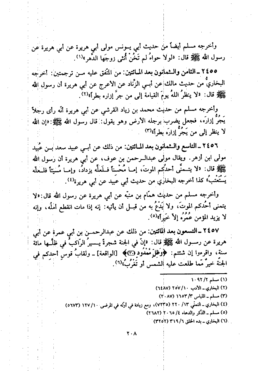 2455 - الثَّامِن وَالثَّمَانُونَ بعد الْمِائَتَيْنِ: من الْمُتَّفق عَلَيْهِ من ترجمتين: أخرجه البُخَارِيّ من حَدِيث مَالك عَن أبي الزِّنَاد عَن الْأَعْرَج عَن أبي هُرَيْرَة أَن رَسُول الله صلى الله عَلَيْهِ وَسلم قَالَ: " لَا ينظر الله يَوْم الْقِيَامَة إِلَى من جر إزَاره بطراً ".
