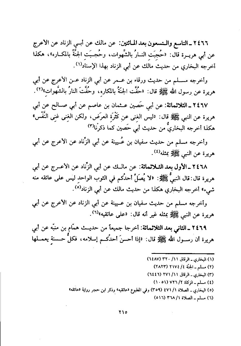 2466 - التَّاسِع وَالتِّسْعُونَ بعد الْمِائَتَيْنِ: عَن مَالك عَن أبي الزِّنَاد عَن الْأَعْرَج عَن أبي هُرَيْرَة قَالَ: " حجبت النَّار بالشهوات، وحجبت الْجنَّة بالمكاره "، هَكَذَا أخرجه البُخَارِيّ من حَدِيث مَالك عَن أبي الزِّنَاد بِهَذَا الْإِسْنَاد.