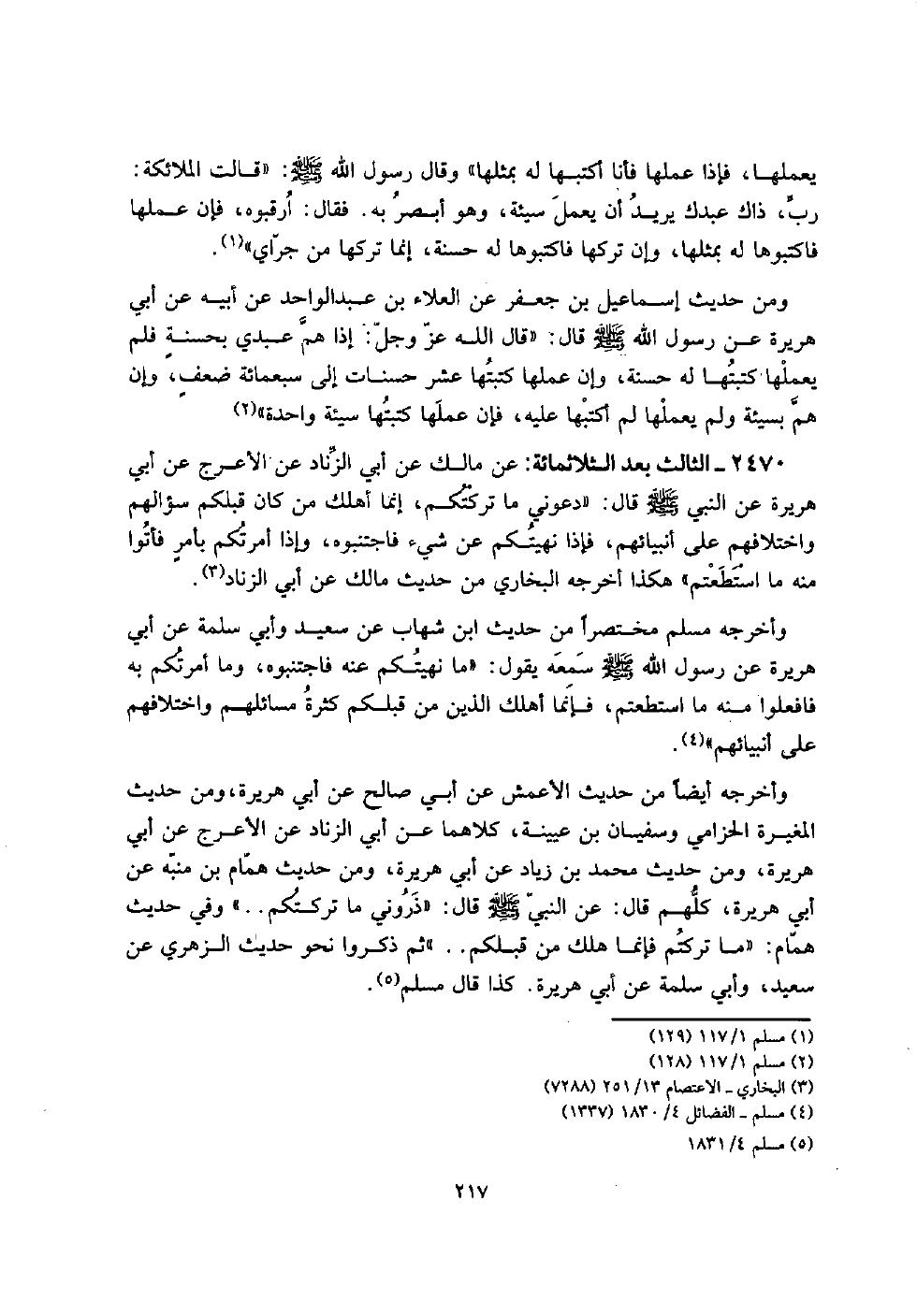 2470 - الثَّالِث بعد الثلاثمائة: عَن مَالك عَن أبي الزِّنَاد عَن الْأَعْرَج عَن أبي هُرَيْرَة عَن النَّبِي صلى الله عَلَيْهِ وَسلم قَالَ: " دَعونِي مَا تركتكم، إِنَّمَا أهلك من كَانَ قبلكُمْ سُؤَالهمْ وَاخْتِلَافهمْ على أَنْبِيَائهمْ، فَإِذا نَهَيْتُكُمْ عَن شَيْء فَاجْتَنبُوهُ، وَإِذا أَمرتكُم بأمرٍ فَأتوا مِنْهُ مَا اسْتَطَعْتُم " هَكَذَا أخرجه البُخَارِيّ من حَدِيث مَالك عَن أبي الزِّنَاد.