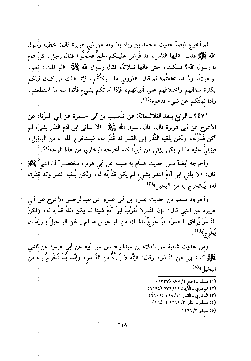 2471 - الرَّابِع عبد الثلاثمائة: عَن شُعَيْب بن أبي حَمْزَة عَن أبي الزِّنَاد عَن الْأَعْرَج عَن أبي هُرَيْرَة قَالَ: قَالَ رَسُول الله صلى الله عَلَيْهِ وَسلم: " لَا يَأْتِي ابْن آدم النّذر بِشَيْء لم أكن قدرته، وَلَكِن يلقيه النّذر إِلَى الْقدر قد قدر لَهُ، فيستخرج الله بِهِ من الْبَخِيل، فيؤتي عَلَيْهِ مَا لم يكن يُؤْتِي من قبل " كَذَا أخرجه البُخَارِيّ من هَذَا الْوَجْه.