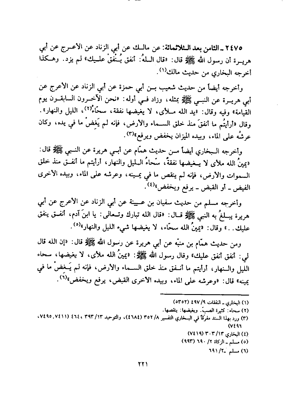 2475 - الثَّامِن بعد الثلاثمائة: عَن مَالك عَن أبي الزِّنَاد عَن الْأَعْرَج عَن أبي هُرَيْرَة أَن رَسُول الله صلى الله عَلَيْهِ وَسلم قَالَ: " قَالَ الله: أنْفق ينْفق عَلَيْك " " لم يزدْ. وَهَكَذَا أخرجه البُخَارِيّ من حَدِيث مَالك.