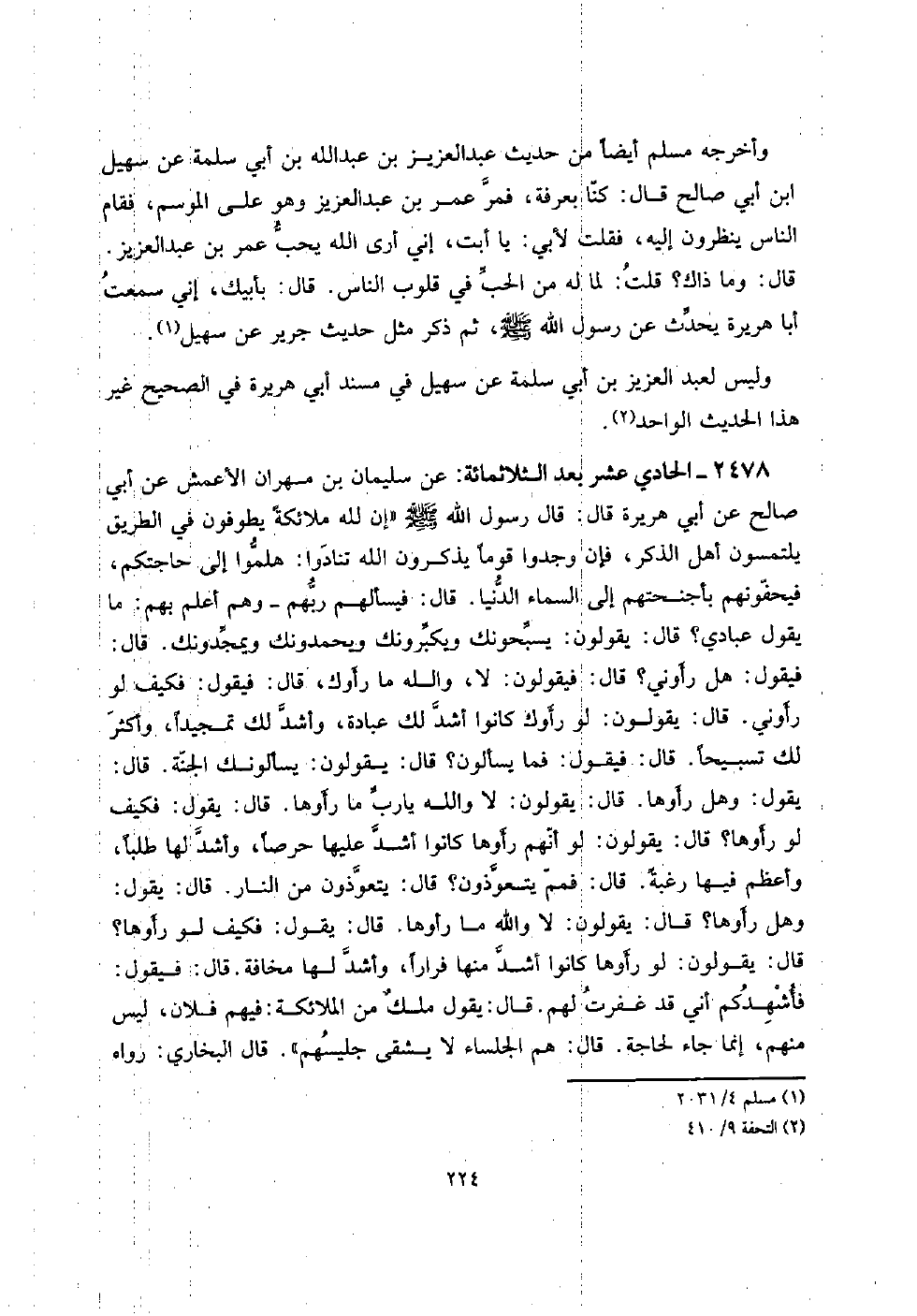 2478 - الْحَادِي عشر بعد الثلاثمائة: عَن سُلَيْمَان بن مهْرَان الْأَعْمَش عَن أبي صَالح عَن أبي هُرَيْرَة قَالَ: قَالَ رَسُول الله صلى الله عَلَيْهِ وَسلم " إِن لله مَلَائِكَة يطوفون فِي الطَّرِيق يَلْتَمِسُونَ أهل الذّكر، فَإِن وجدوا قوما يذكرُونَ الله تنادوا: هلموا إِلَى حَاجَتكُمْ، فيحفونهم بأجنحتهم إِلَى السَّمَاء الدُّنْيَا. قَالَ: فيسألهم رَبهم - وهم أعلم بهم: مَا يَقُول عبَادي؟ قَالَ: يَقُولُونَ: يسبحونك ويكبرونك ويحمدونك ويمجدونك. قَالَ: فَيَقُول: هَل رأوني؟ قَالَ: فَيَقُولُونَ: لَا، وَالله مَا رأوك، قَالَ: فَيَقُول: فَكيف لَو رأوني. قَالَ: يَقُولُونَ: لَو رأوك كَانُوا أَشد لَك عبَادَة، وَأَشد لَك تمجيداً، وَأكْثر لَك تسبيحاً. قَالَ: فَيَقُول: فَمَا يسْأَلُون؟ قَالَ: يَقُولُونَ: يَسْأَلُونَك الْجنَّة. قَالَ: يَقُول: وَهل رأوها. قَالَ: يَقُولُونَ: لَا وَالله يَا رب مَا رأوها. قَالَ: يَقُول: فَكيف لَو رأوها؟ قَالَ: يَقُولُونَ: لَو أَنهم رأوها كَانُوا أَشد عَلَيْهَا حرصاً، وَأَشد لَهَا طلبا، وَأعظم فِيهَا رَغْبَة. قَالَ: فمم يتعوذون؟ قَالَ: يتعوذون من النَّار. قَالَ: يَقُول: وَهل رأوها؟ قَالَ: يَقُولُونَ: لَا وَالله مَا رأوها. قَالَ: يَقُول: فَكيف لَو رأوها؟ قَالَ: يَقُولُونَ: لَو رأوها كَانُوا أَشد مِنْهَا فِرَارًا، وَأَشد لَهَا مَخَافَة. قَالَ: فَيَقُول: فأشهدكم أَنِّي قد غفرت لَهُم. قَالَ: يَقُول ملكٌ من الْمَلَائِكَة: فيهم فلَان، لَيْسَ مِنْهُم، إِنَّمَا جَاءَ لحَاجَة. قَالَ: هم الجلساء لَا يشقى جليسهم ". قَالَ البُخَارِيّ: رَوَاهُ