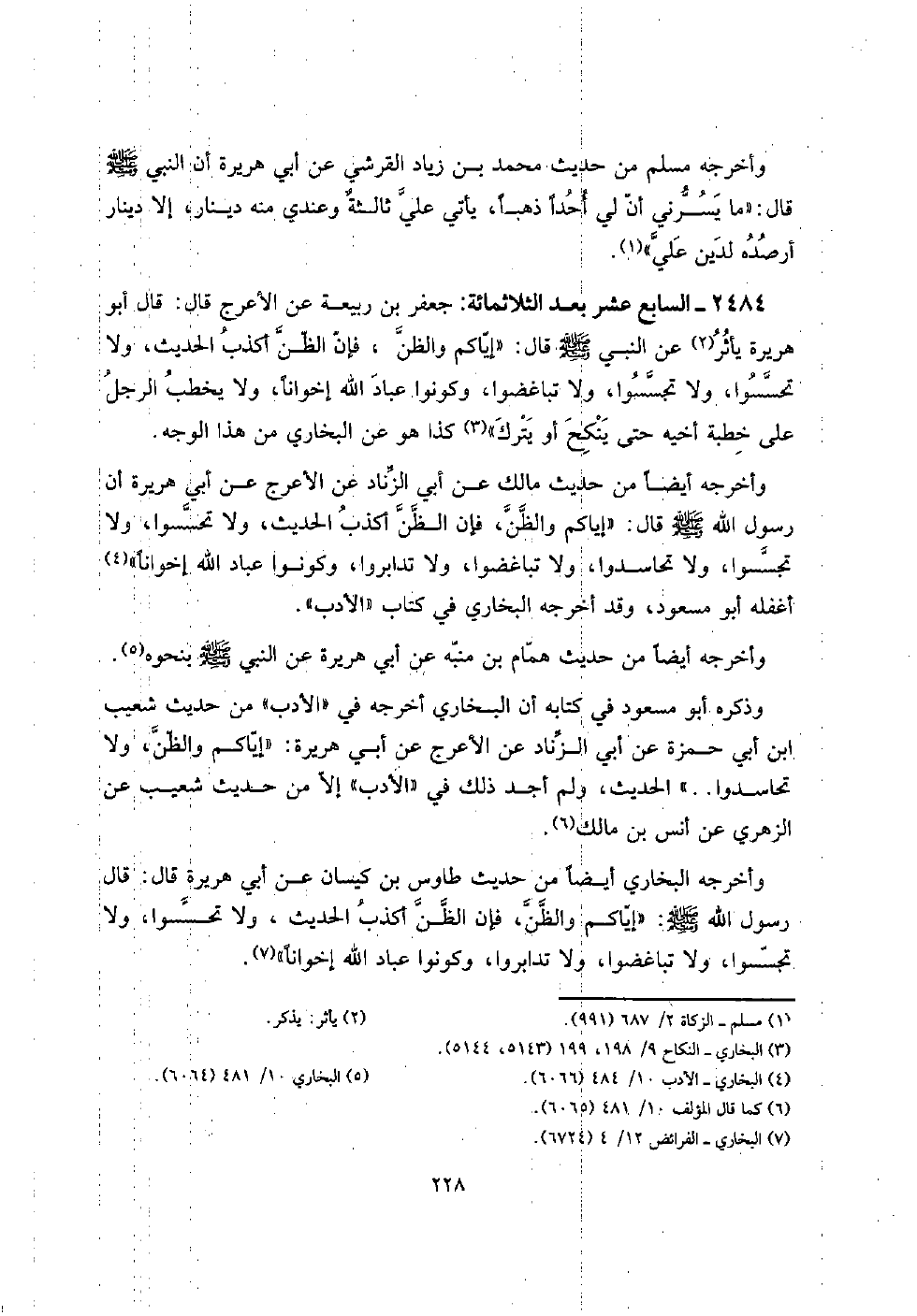 2484 - السَّابِع عشر بعد الثلاثمائة: جَعْفَر بن ربيعَة عَن الْأَعْرَج قَالَ: قَالَ أَبُو هُرَيْرَة يأثر عَن النَّبِي صلى الله عَلَيْهِ وَسلم قَالَ: " إيَّاكُمْ وَالظَّن، فَإِن الظَّن أكذب الحَدِيث، وَلَا تحسسوا، وَلَا تجسسوا وَلَا تباغضوا، وَكُونُوا عباد الله إخْوَانًا، وَلَا يخْطب الرجل على خطْبَة أَخِيه حَتَّى ينْكح أَو يتْرك " كَذَا هُوَ عَن البُخَارِيّ من هَذَا الْوَجْه.
