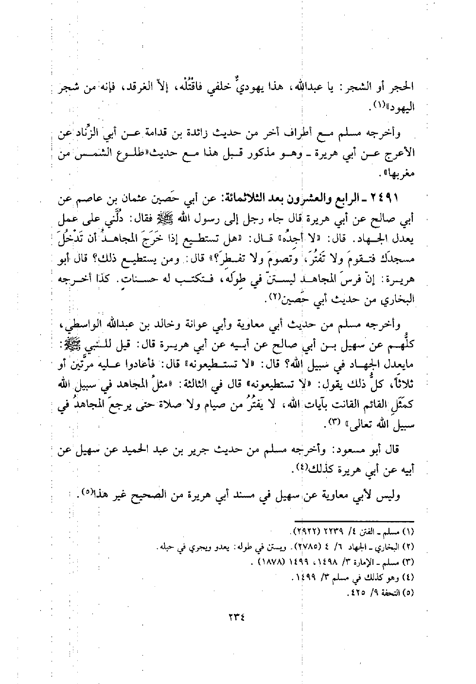 2491 - الرَّابِع وَالْعشْرُونَ بعد الثلاثمائة: عَن أبي حُصَيْن عُثْمَان بن عَاصِم عَن أبي صَالح عَن أبي هُرَيْرَة قَالَ جَاءَ رجل إِلَى رَسُول الله صلى الله عَلَيْهِ وَسلم فَقَالَ: " دلَّنِي على عمل يعدل الْجِهَاد. قَالَ: " لَا أَجِدهُ " قَالَ: " هَل تَسْتَطِيع إِذا خرج الْمُجَاهِد أَن تدخل مسجدك فتقوم وَلَا تفتر، وتصوم وَلَا تفطر؟ " قَالَ: وَمن يَسْتَطِيع ذَلِك؟ قَالَ أَبُو هُرَيْرَة: إِن فرس الْمُجَاهِد ليستن فِي طوله، فتكتب لَهُ حسناتٍ. كَذَا أخرجه البُخَارِيّ من حَدِيث أبي حُصَيْن.