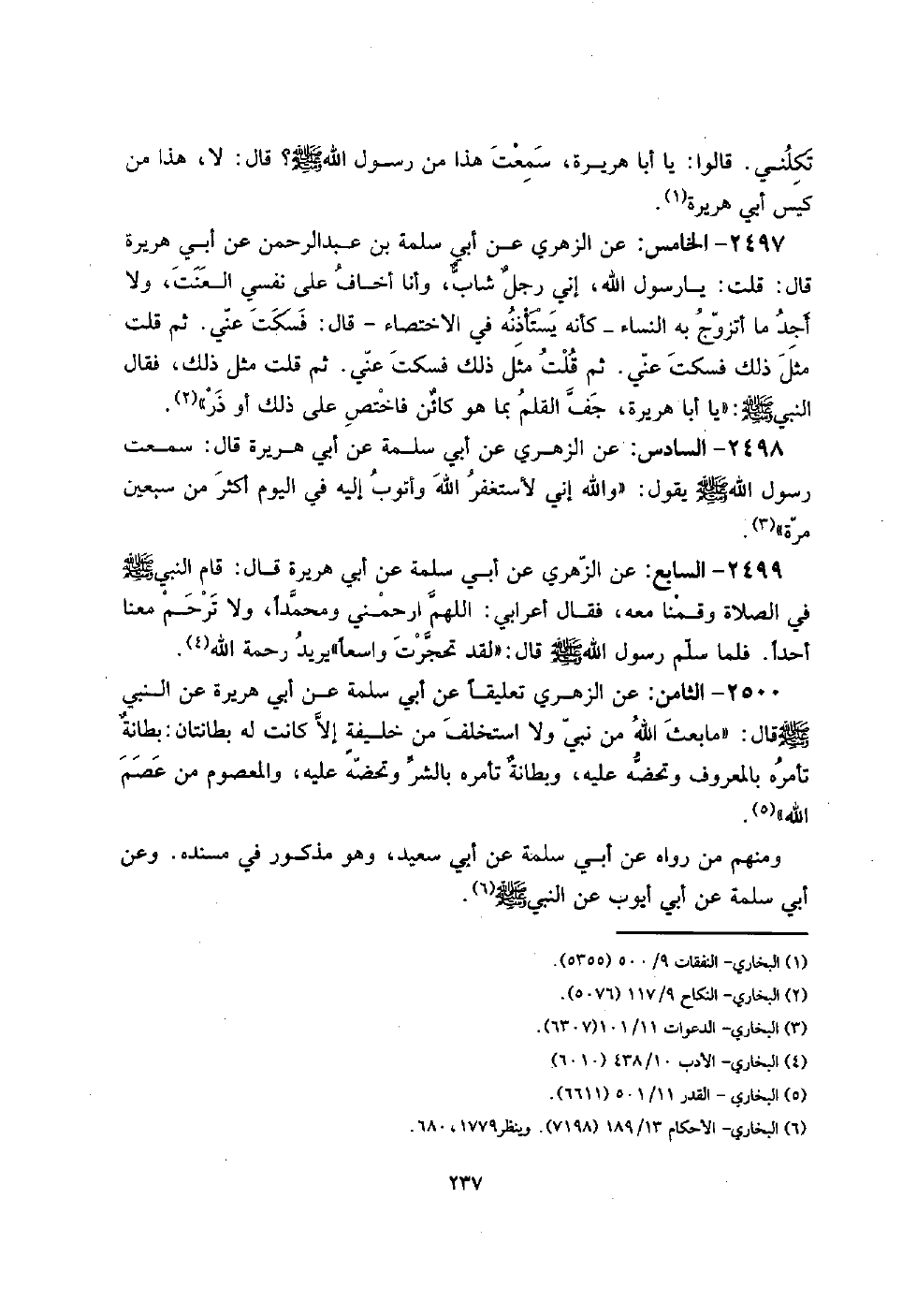 2498 - السَّادِس: عَن الزُّهْرِيّ عَن أبي سَلمَة عَن أبي هُرَيْرَة قَالَ: سَمِعت رَسُول الله صلى الله عَلَيْهِ وَسلم يَقُول: " وَالله إِنِّي لأستغفر الله وَأَتُوب إِلَيْهِ فِي الْيَوْم أَكثر من سبعين مرّة ".
