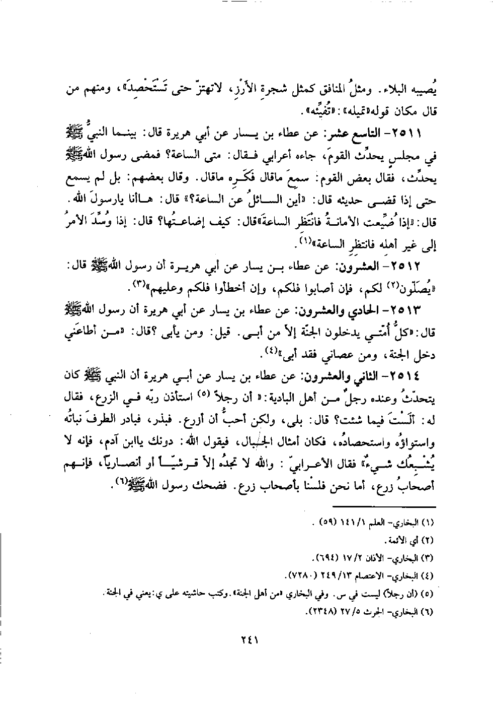2511 - التَّاسِع عشر: عَن عَطاء بن يسَار عَن أبي هُرَيْرَة قَالَ: بَيْنَمَا النَّبِي صلى الله عَلَيْهِ وَسلم فِي مجلسٍ يحدث الْقَوْم، جَاءَهُ أَعْرَابِي فَقَالَ: مَتى السَّاعَة؟ فَمضى رَسُول الله صلى الله عَلَيْهِ وَسلم
