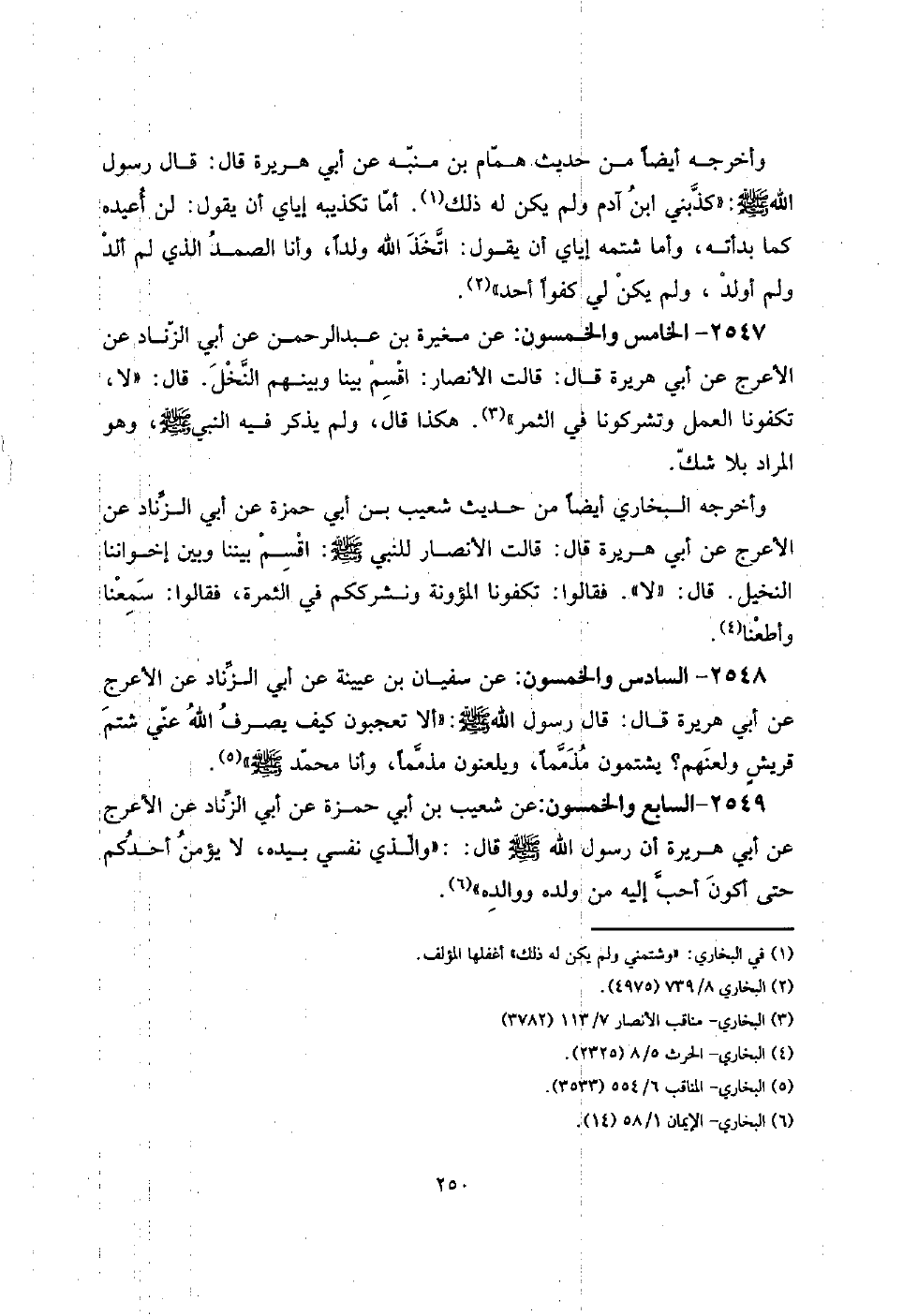 2547 - الْخَامِس وَالْخَمْسُونَ: عَن مُغيرَة بن عبد الرَّحْمَن عَن أبي الزِّنَاد عَن الْأَعْرَج عَن أبي هُرَيْرَة قَالَ: قَالَت الْأَنْصَار: اقْسمْ بَينا وَبينهمْ النّخل. قَالَ: " لَا، تكفونا الْعَمَل وتشركونا فِي الثَّمر ". هَكَذَا قَالَ، وَلم يذكر فِيهِ النَّبِي صلى الله عَلَيْهِ وَسلم، وَهُوَ المُرَاد بِلَا شكّ.