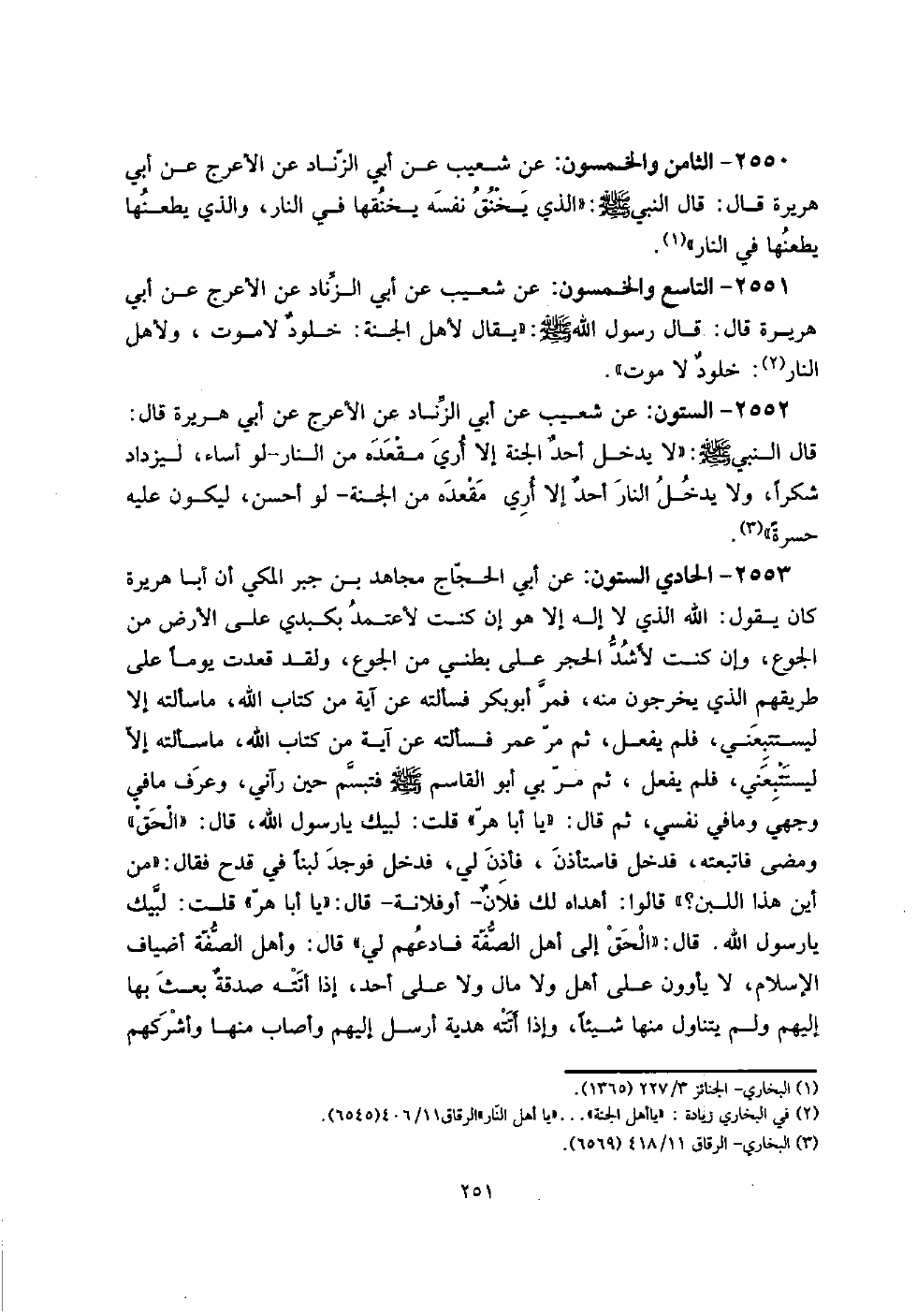 2551 - التَّاسِع وَالْخَمْسُونَ: عَن شُعَيْب عَن أبي الزِّنَاد عَن الْأَعْرَج عَن أبي هُرَيْرَة قَالَ: قَالَ رَسُول الله صلى الله عَلَيْهِ وَسلم: " يُقَال لأهل الْجنَّة: خلودٌ لَا موت، وَلأَهل النَّار: خلودٌ لَا موت ".