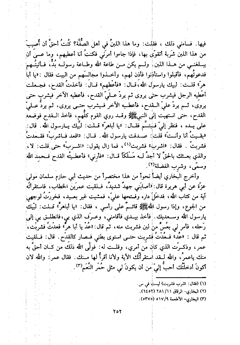 أصابني جهدٌ شديدٌ، فَلَقِيت عمر بن الْخطاب، فاستقرأته آيَة من كتاب الله، فَدخل دَاره وَفتحهَا عَليّ، فمشيت غير بعيد، فَخَرَرْت لوجهي من الْجُوع، وَإِذا رَسُول الله صلى الله عَلَيْهِ وَسلم قائمٌ على رَأْسِي، فَقَالَ: " يَا أَبَا هرٍّ " قلت: لبيْك يَا رَسُول الله وَسَعْديك. فَأخذ بيَدي فأقامني، وَعرف الَّذِي بِي، فَانْطَلق بِي إِلَى رَحْله، فَأمر لي بعسٍّ من لبن فَشَرِبت مِنْهُ، ثمَّ قَالَ: " عد يَا أَبَا هرٍّ " فعدت فَشَرِبت، ثمَّ قَالَ: " عد " فعدت فَشَرِبت حَتَّى اسْتَوَى بَطْني فَصَارَ كالقدح. قَالَ: فَلَقِيت عمر، وَذكرت الَّذِي كَانَ من أَمْرِي، وَقلت لَهُ: فولى الله ذَلِك من كَانَ أَحَق بِهِ مِنْك يَا عمر، وَالله لقد استقرأتك الْآيَة ولأنا أَقرَأ لَهَا مِنْك. فَقَالَ عمر: وَالله لِأَن أكون أدخلتك أحب إِلَيّ من أَن يكون لي مثل حمر النعم.