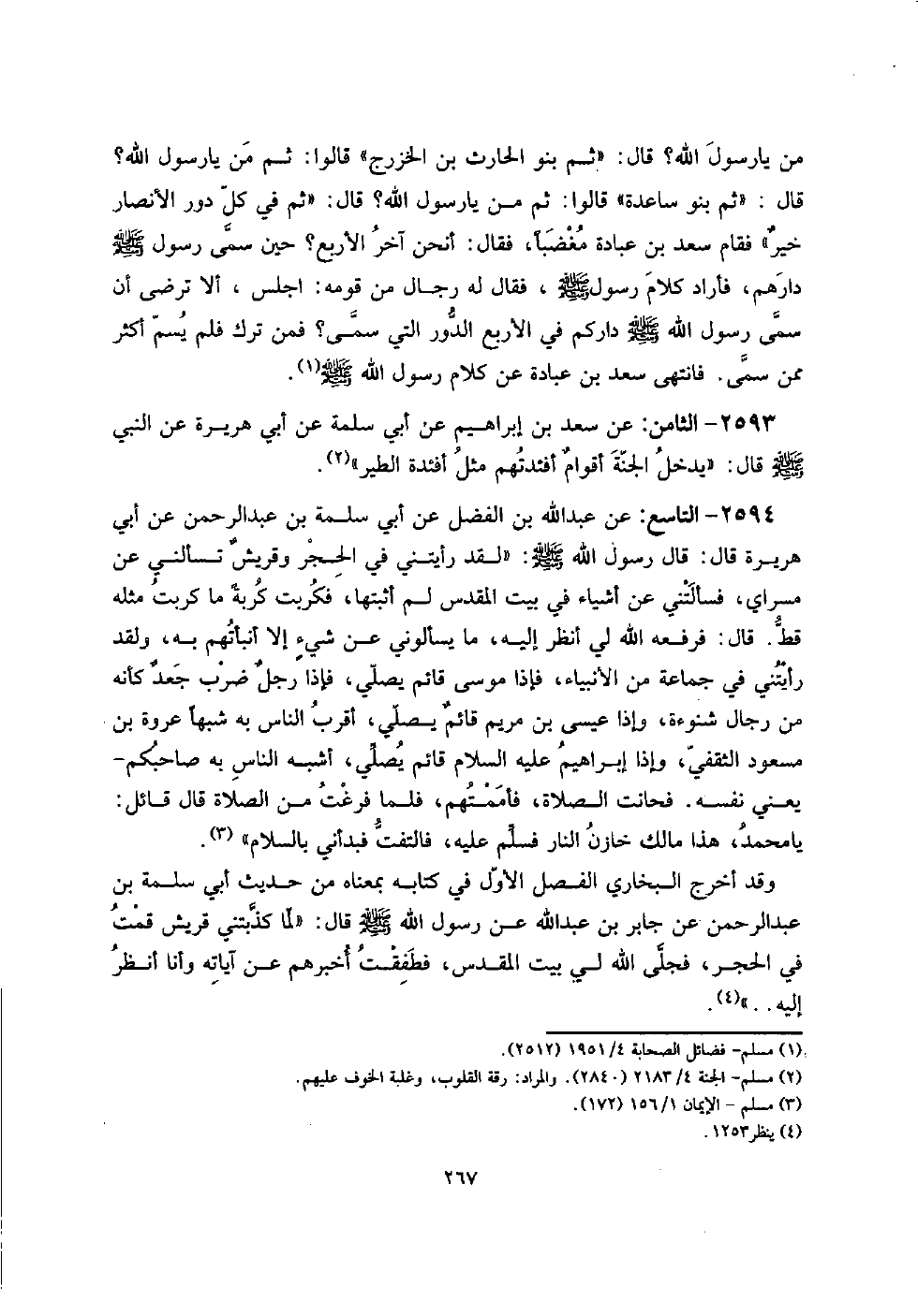 2594 - التَّاسِع: عَن عبد الله بن الْفضل عَن أبي سَلمَة بن عبد الرَّحْمَن عَن أبي هُرَيْرَة قَالَ: قَالَ رَسُول الله صلى الله عَلَيْهِ وَسلم: " لقد رَأَيْتنِي فِي الْحجر وقريشٌ تَسْأَلنِي عَن مسراي، فسألتني عَن أَشْيَاء فِي بَيت الْمُقَدّس لم أثبتها، فكربت كربَة مَا كربت مثله قطّ. قَالَ: فرفعه الله لي أنظر إِلَيْهِ، مَا يَسْأَلُونِي عَن شيءٍ إِلَّا أنبأتهم بِهِ، وَلَقَد رَأَيْتنِي فِي جمَاعَة من الْأَنْبِيَاء، فَإِذا مُوسَى قَائِم يُصَلِّي، فَإِذا رجلٌ ضرب جعدٌ كَأَنَّهُ من رجال شنُوءَة، وَإِذا عِيسَى بن مَرْيَم قائمٌ يُصَلِّي، أقرب النَّاس بِهِ شبها عُرْوَة بن مَسْعُود الثَّقَفِيّ، وَإِذا إِبْرَاهِيم عَلَيْهِ السَّلَام قَائِم يُصَلِّي، أشبه النَّاس بِهِ صَاحبكُم - يَعْنِي نَفسه. فحانت الصَّلَاة، فأممتهم فَلَمَّا فرغت من الصَّلَاة قَالَ قَائِل: يَا مُحَمَّد، هَذَا مَالك خَازِن النَّار فَسلم عَلَيْهِ، فَالْتَفت فبدأني بِالسَّلَامِ ".