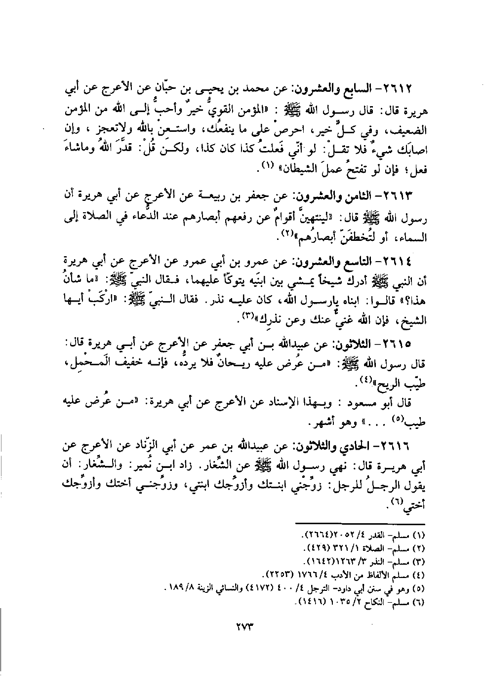 2613 - الثَّامِن وَالْعشْرُونَ: عَن جَعْفَر بن ربيعَة عَن الْأَعْرَج عَن أبي هُرَيْرَة أَن رَسُول الله صلى الله عَلَيْهِ وَسلم قَالَ: " لينتهين أقوامٌ عَن رفعهم أَبْصَارهم عِنْد الدُّعَاء فِي الصَّلَاة إِلَى السَّمَاء، أَو لتخطفن أَبْصَارهم ".