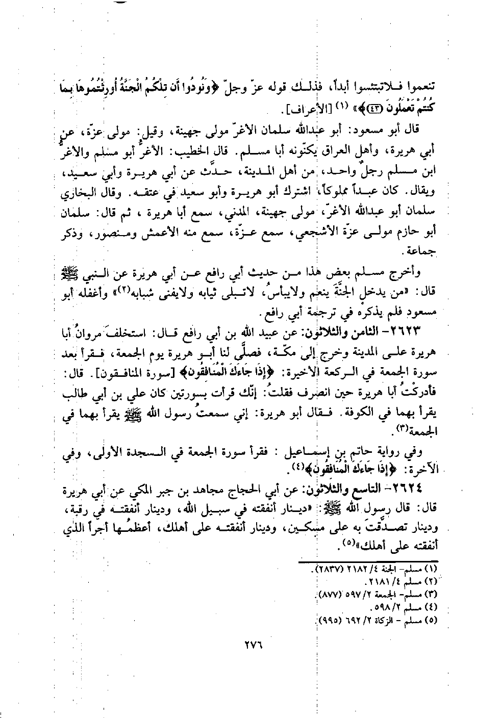 2624 - التَّاسِع وَالثَّلَاثُونَ: عَن أبي الْحجَّاج مُجَاهِد بن جبر الْمَكِّيّ عَن أبي هُرَيْرَة قَالَ: قَالَ رَسُول الله صلى الله عَلَيْهِ وَسلم: " دِينَار أنفقته فِي سَبِيل الله، ودينار أنفقته فِي رَقَبَة، ودينار تَصَدَّقت بِهِ على مِسْكين، ودينار أنفقته على أهلك، أعظمها أجرا الَّذِي أنفقته على أهلك ".