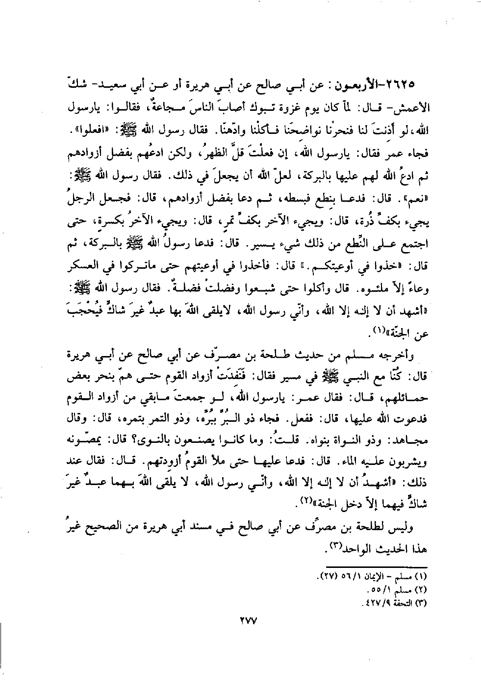 2625 - الْأَرْبَعُونَ: عَن أبي صَالح عَن أبي هُرَيْرَة أَو عَن أبي سعيد - شكّ الْأَعْمَش - قَالَ: لما كَانَ يَوْم غَزْوَة تَبُوك أصَاب النَّاس مجاعةٌ، فَقَالُوا: يَا رَسُول الله، لَو أَذِنت لنا فنحرنا نواضحنا فأكلنا وادهنا. فَقَالَ رَسُول الله صلى الله عَلَيْهِ وَسلم: " افعلوا ".