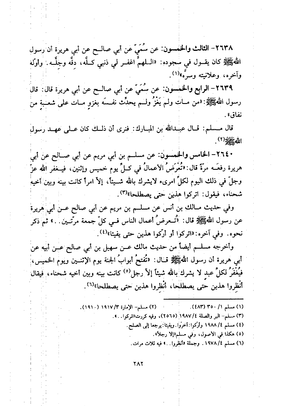 2640 - الْخَامِس وَالْخَمْسُونَ: عَن مُسلم بن أبي مَرْيَم عَن أبي صَالح عَن أبي هُرَيْرَة رَفعه مرّة قَالَ: " تعرض الْأَعْمَال فِي كل يَوْم خَمِيس وإثنين، فَيغْفر الله عز وَجل فِي ذَلِك الْيَوْم لكل امْرِئ لَا يُشْرك بِاللَّه شَيْئا، إِلَّا امْرأ كَانَت بَينه وَبَين أَخِيه شَحْنَاء، فَيَقُول: اتْرُكُوا هذَيْن حَتَّى يصطلحا ".