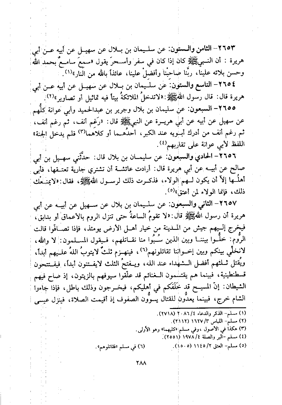 2657 - الثَّانِي وَالسَّبْعُونَ: عَن سُلَيْمَان بن بِلَال عَن سُهَيْل عَن أَبِيه عَن أبي هُرَيْرَة أَن رَسُول الله صلى الله عَلَيْهِ وَسلم قَالَ: " لَا تقوم السَّاعَة حَتَّى تنزل الرّوم بالأعماق أَو بدابق، فَيخرج إِلَيْهِم جَيش من الْمَدِينَة من خِيَار أهل الأَرْض يومئذٍ، فَإِذا تصافوا قَالَت الرّوم: خلوا بَيْننَا وَبَين الَّذين سبوا منا نقاتلهم، فَيَقُول الْمُسلمُونَ: لَا وَالله، لَا نخلي بَيْنكُم وَبَين إِخْوَاننَا تقاتلونهم، فينهزم ثلثٌ لَا يَتُوب الله عَلَيْهِم أبدا، وَيقتل ثلثهم أفضل الشُّهَدَاء عِنْد الله، وَيفتح الثُّلُث لَا يفتنون أبدا، فيفتتحون قسطنطينية، فَبَيْنَمَا هم يقتسمون الْغَنَائِم قد عَلقُوا سيوفهم بالزيتون، إِذْ صَاح فيهم الشَّيْطَان: إِن الْمَسِيح قد خلفكم فِي أهليكم، فَيخْرجُونَ وَذَلِكَ بَاطِل، فَإِذا جَاءُوا الشَّام خرج، فَبَيْنَمَا يعدون لِلْقِتَالِ يسوون الصُّفُوف إِذْ أُقِيمَت الصَّلَاة، فَينزل عِيسَى