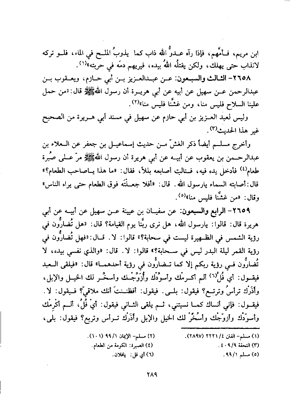 2659 - الرَّابِع وَالسَّبْعُونَ: عَن سُفْيَان بن عُيَيْنَة عَن سُهَيْل عَن أَبِيه عَن أبي هُرَيْرَة قَالَ: قَالُوا: يَا رَسُول الله، هَل نرى رَبنَا يَوْم الْقِيَامَة؟ قَالَ: " هَل تضَارونَ فِي رُؤْيَة الشَّمْس فِي الظهيرة لَيست فِي سَحَابَة؟ " قَالُوا: لَا. قَالَ: " فَهَل تضَارونَ فِي رُؤْيَة الْقَمَر لَيْلَة الْبَدْر لَيْسَ فِي سَحَابَة؟ " قَالُوا: لَا. قَالَ: " وَالَّذِي نَفسِي بِيَدِهِ، لَا تضَارونَ فِي رُؤْيَة ربكُم إِلَّا كَمَا تضَارونَ فِي رُؤْيَة أَحدهمَا " قَالَ: " فَيلقى العَبْد فَيَقُول: أَي فل ألم أكرمك وأسودك وأزوجك وأسخر لَك الْخَيل وَالْإِبِل، وأذرك ترأس وترتع؟ فَيَقُول: بلَى. فَيَقُول: أفظننت أَنَّك ملاقي؟ فَيَقُول: لَا.