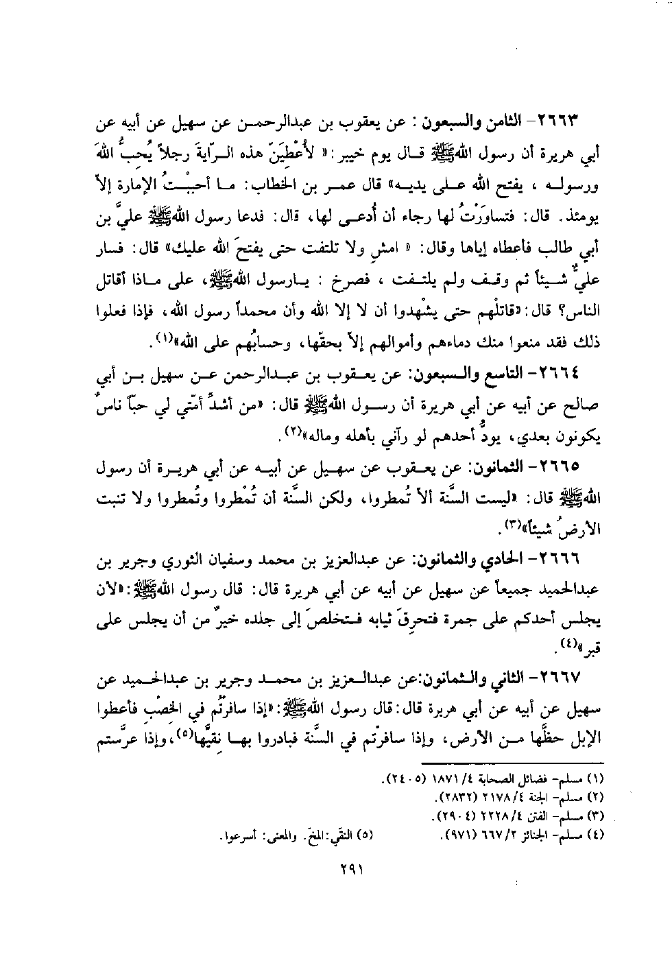 2663 - الثَّامِن وَالسَّبْعُونَ: عَن يَعْقُوب بن عبد الرَّحْمَن عَن سُهَيْل عَن أَبِيه عَن أبي هُرَيْرَة أَن رَسُول الله صلى الله عَلَيْهِ وَسلم قَالَ يَوْم خَيْبَر: " لَأُعْطيَن هَذِه الرَّايَة رجلا يحب الله وَرَسُوله، يفتح الله على يَدَيْهِ " قَالَ عمر بن الْخطاب: مَا أَحْبَبْت الْإِمَارَة إِلَّا يومئذٍ. قَالَ: فتساورت لَهَا رَجَاء أَن أدعى لَهَا، قَالَ: فَدَعَا رَسُول الله صلى الله عَلَيْهِ وَسلم عَليّ بن أبي طَالب فَأعْطَاهُ إِيَّاهَا وَقَالَ: " امش وَلَا تلْتَفت حَتَّى يفتح الله عَلَيْك " قَالَ: فَسَار عليٌّ شَيْئا ثمَّ وقف وَلم يلْتَفت، فَصَرَخَ: يَا رَسُول الله صلى الله عَلَيْهِ وَسلم: على مَاذَا أقَاتل النَّاس؟ قَالَ: " قَاتلهم حَتَّى يشْهدُوا أَن لَا إِلَّا الله وَأَن مُحَمَّدًا رَسُول الله، فَإِذا فعلوا ذَلِك فقد منعُوا مِنْك دِمَاءَهُمْ وَأَمْوَالهمْ إِلَّا بِحَقِّهَا، وحسابهم على الله ".