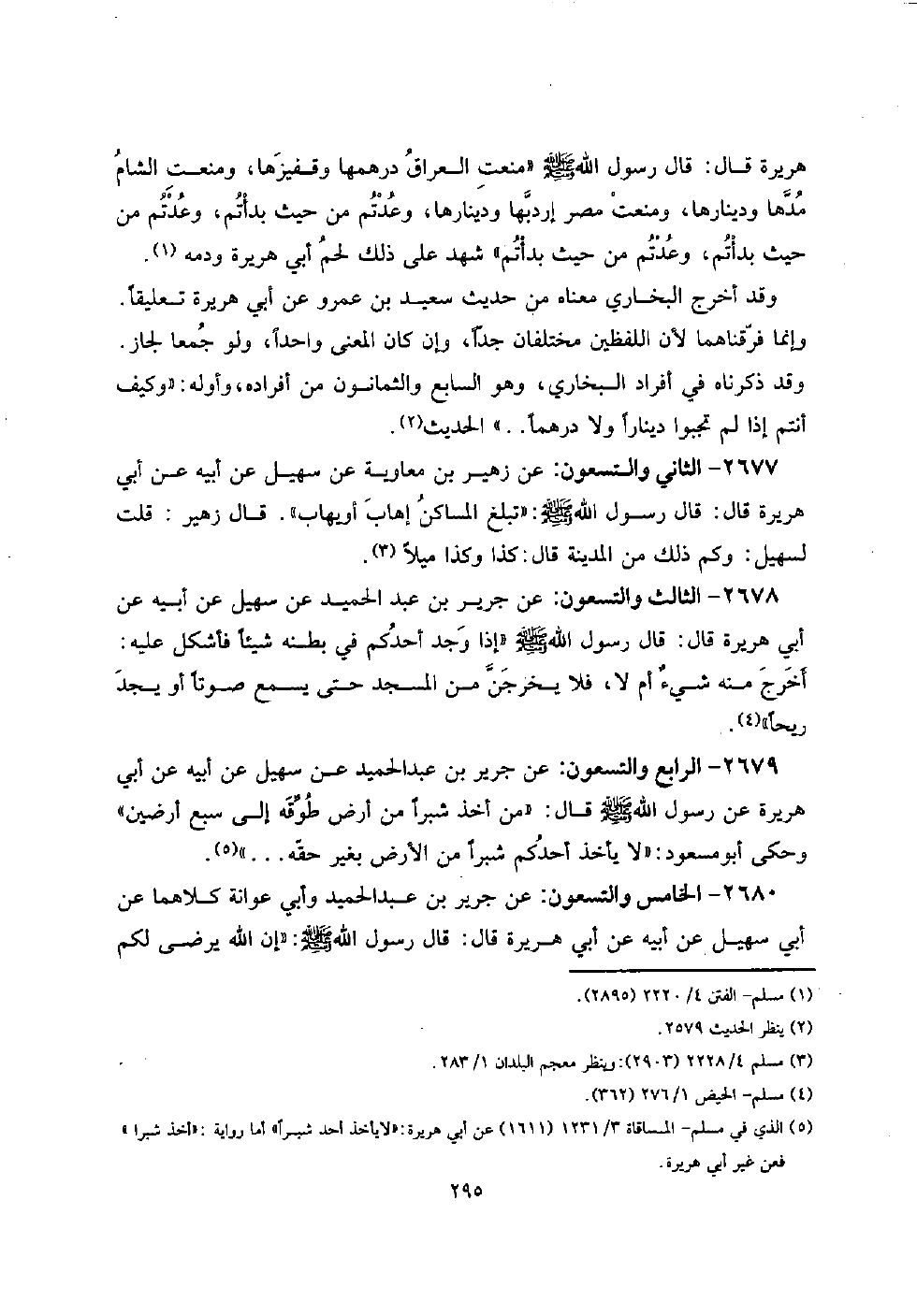 2679 - الرَّابِع وَالتِّسْعُونَ: عَن جرير بن عبد الحميد عَن سُهَيْل عَن أَبِيه عَن أبي هُرَيْرَة عَن رَسُول الله صلى الله عَلَيْهِ وَسلم قَالَ: " من أَخذ شبْرًا من أَرض طوقه إِلَى سبع أَرضين " وَحكى أَبُو مَسْعُود: " لَا يَأْخُذ أحدكُم شبْرًا من الأَرْض بِغَيْر حَقه ... ".