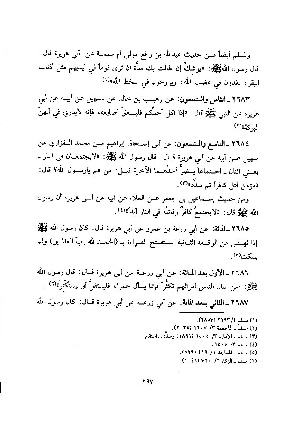 2686 - الأول بعد الْمِائَة: عَن أبي زرْعَة عَن أبي هُرَيْرَة قَالَ: قَالَ رَسُول الله صلى الله عَلَيْهِ وَسلم: " من سَأَلَ النَّاس أَمْوَالهم تكثراً فَإِنَّمَا يسْأَل جمراً، فليستقل أَو ليستكثر ".