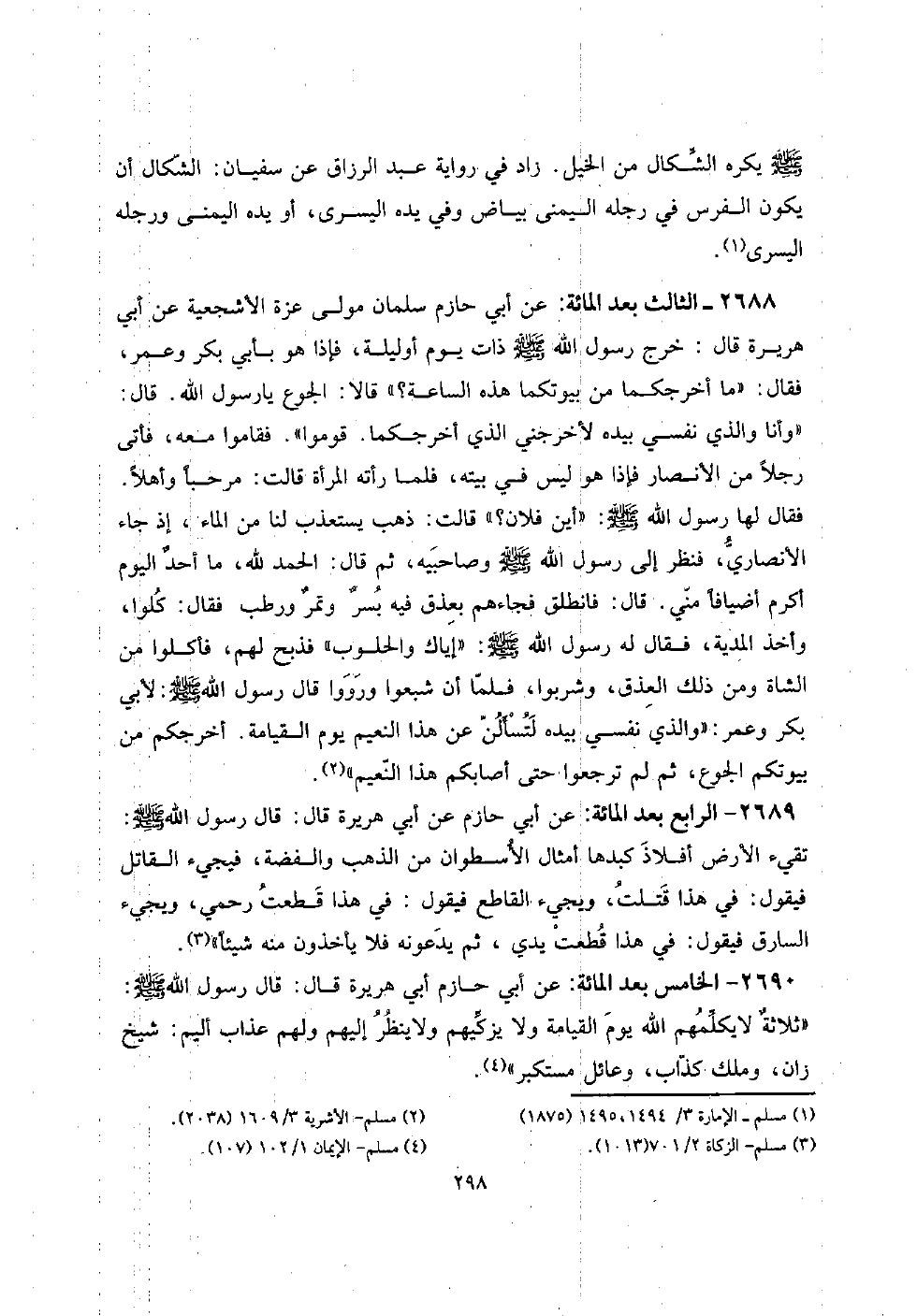 2690 - الْخَامِس بعد الْمِائَة: عَن أبي حَازِم أبي هُرَيْرَة قَالَ: قَالَ رَسُول الله صلى الله عَلَيْهِ وَسلم: " ثلاثةٌ لَا يكلمهم الله يَوْم الْقِيَامَة وَلَا يزكيهم وَلَا ينظر إِلَيْهِم وَلَهُم عَذَاب أَلِيم: شيخ زَان، وَملك كَذَّاب، وعائل مستكبر ".