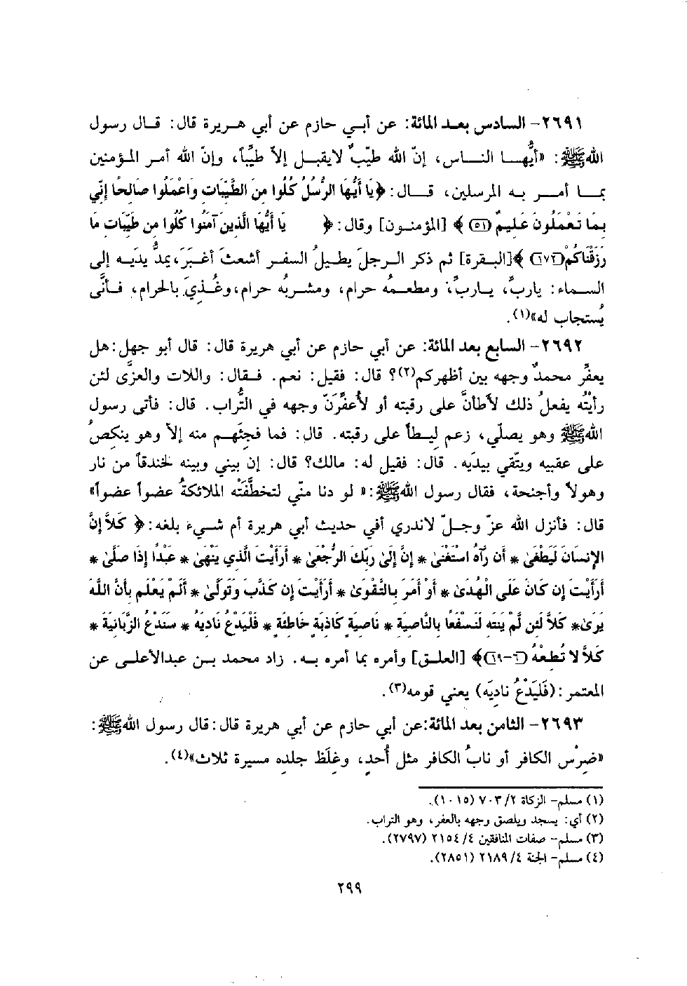 2692 - السَّابِع بعد الْمِائَة: عَن أبي حَازِم عَن أبي هُرَيْرَة قَالَ: قَالَ أَبُو جهل: هَل يعفر محمدٌ وَجهه بَين أظْهركُم قَالَ: فَقيل: نعم. فَقَالَ: وَاللات والعزى لَئِن رَأَيْته يفعل ذَلِك لَأَطَأَن على رقبته أَو لأُعَفِّرَنَّ وَجهه فِي التُّرَاب. قَالَ: فَأتى رَسُول الله صلى الله عَلَيْهِ وَسلم وَهُوَ يُصَلِّي، زعم ليَطَأ على رقبته. قَالَ: فَمَا فَجِئَهُمْ مِنْهُ إِلَّا وَهُوَ يَنْكص على عَقِبَيْهِ وَيَتَّقِي بيدَيْهِ. قَالَ: فَقيل لَهُ: مَالك؟ قَالَ: إِن بيني وَبَينه لَخَنْدَقًا من نَار وَهولا وَأَجْنِحَة، فَقَالَ رَسُول الله صلى الله عَلَيْهِ وَسلم: " لَو دنا مني لتخطفته الْمَلَائِكَة عضوا عضوا ". قَالَ: فَأنْزل الله عز وَجل لَا نَدْرِي أَفِي حَدِيث أبي هُرَيْرَة أم شَيْء بلغه: {كلا إِن الْإِنْسَان ليطْغى أَن رَآهُ اسْتغنى إِن إِلَى رَبك الرجعى أَرَأَيْت الَّذِي ينْهَى} عبدا إِلَى صلى أَرَأَيْت إِن كَانَ على الْهدى أَو أَمر بالتقوى أَرَأَيْت إِن كذب وَتَوَلَّى ألم يعلم بِأَن الله يرى كلا لَئِن لم ينْتَه لنسفعاً بالناصية ناصيةٍ كَاذِبَة خاطئة فَليدع نَادِيه سَنَدع الزَّبَانِيَة كلا لَا تطعه} [العلق] وَأمره بِمَا أمره بِهِ. زَاد مُحَمَّد بن عبد الْأَعْلَى عَن الْمُعْتَمِر: {فَليدع نَادِيه} يَعْنِي قومه.